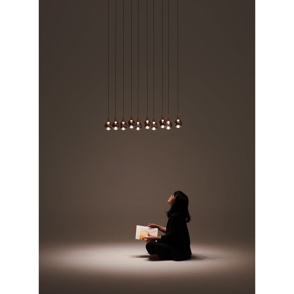Inspired by organic shapes and the artistry of fine jewelry, the Pao Pao collection earned its name from the word "Bubble" in Mandarin. Available in three colorways, and multiple configurations, the signature tear-drop silhouette of each pendant consists of a matching color glass sphere and metal cap. Each glass sphere is mouth-blown and vacuum plated to create an unique layered effect. The glass sphere