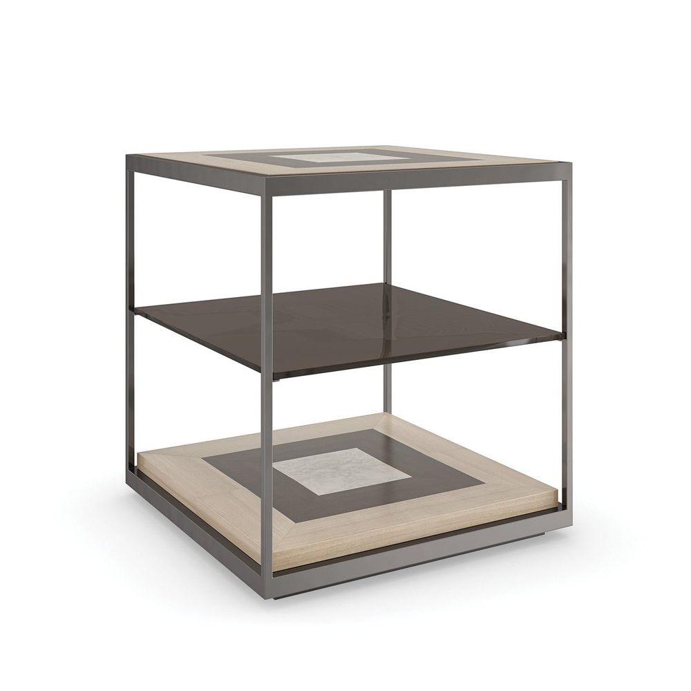 With a captivating geometric pattern, this end table adds depth and unique perspective to living interiors. Intricately pieced veneers in a mix of Dyed Tupelo, Japanese Sen and Madrona Burl tie the table to our Escher chest and Illusion cocktail table, celebrating the time-honored art of parquetry. Features a removable tempered glass shelf in Smoked Bronze for further reflection and functionality.