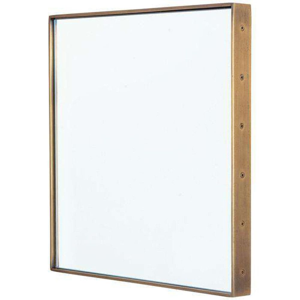 Solid aged brass finish steel metal frame square mirror with aged brass screw details. Each mirror has 24 hand attached screw 'grommets' for a modern detail in repeat around the square mirror. Mirror hangs with d ring wall hangers. Hang the mirrors in multiples for a designer wall statement. Each mirror is sold individually.