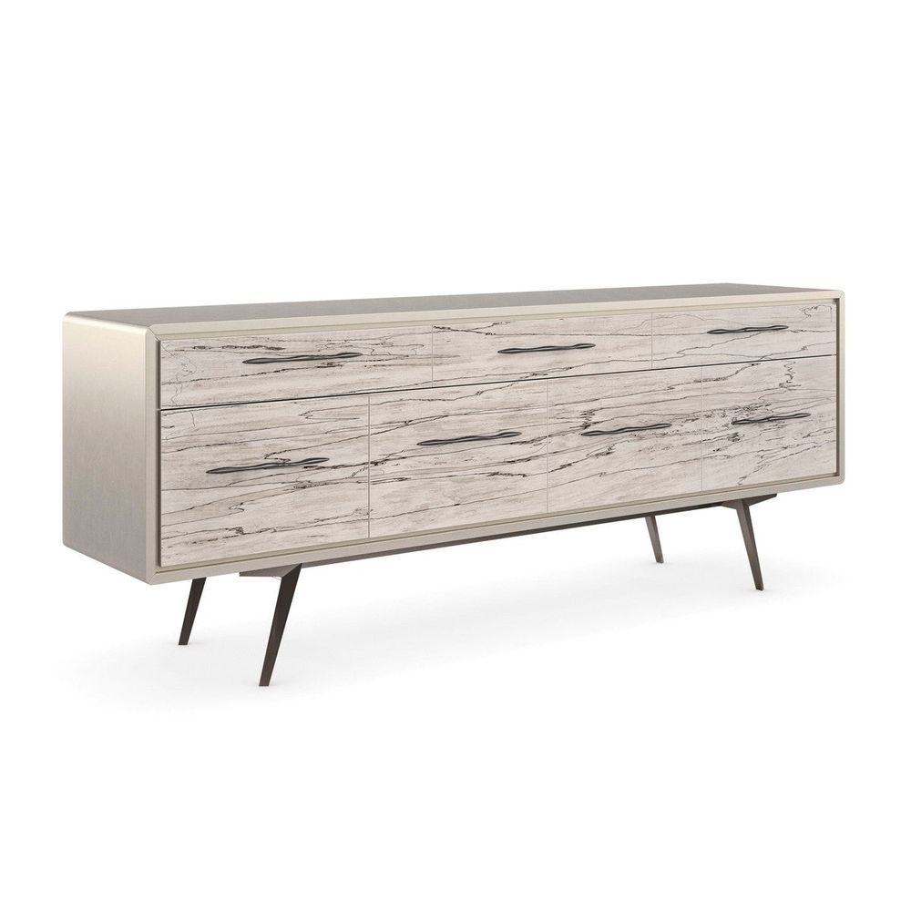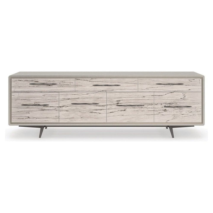 An artful interpretation of found beauty in the natural world, this clean-lined credenza brings a look of casual luxury to living interiors. Masterfully crafted with top drawer fronts and bottom doors in Snowcap Organic-our exclusive, bleached white printed spalted maple veneer-and encased in a Matte Pearl finish for a hint of shimmer. Custom hardware adds interest and emulates the marble-like veining of spalted maple. Features cutouts in the back for wire management, and adjustable metal legs that allow you to raise the height for a more traditional console, or lower it to accommodate media.