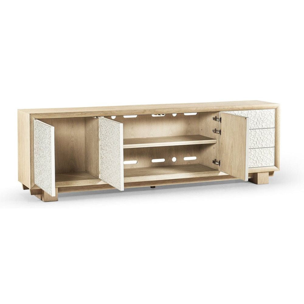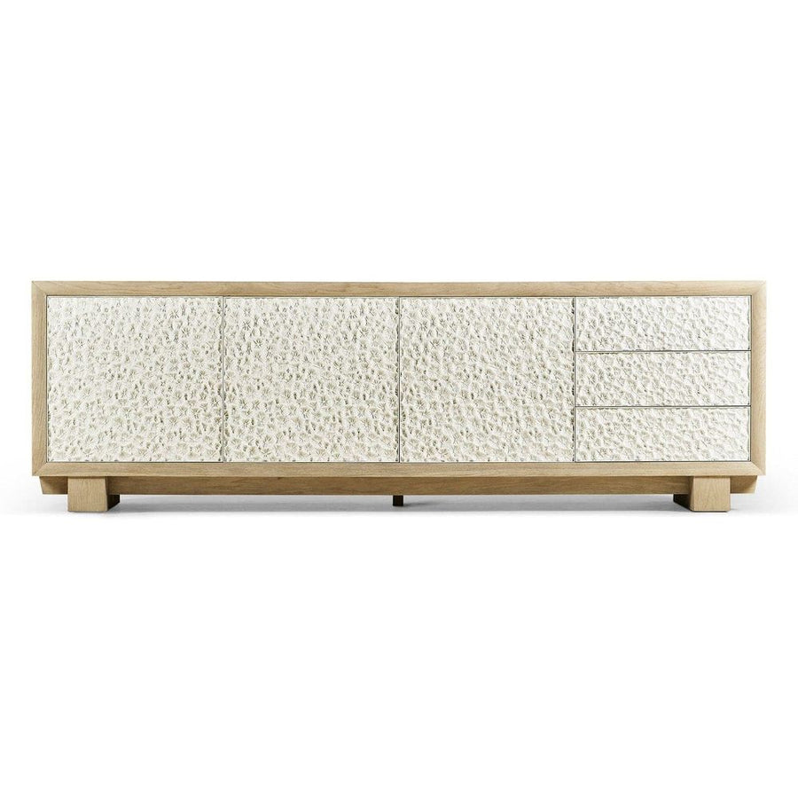 Inspired by fossilized coral, Pelagic boasts an intricate pattern on metal doors produced by lost wax casting. Resting on a hefty linear base, the solid bleached oak case has a primitive and contemporary aesthetic. Three stacked drawers on the far right combine seamlessly with shelving behind cabinet doors for functionality and quality craftsmanship befitting entertainment systems or general catch-all displays. Perfect for tropical themed interiors, Pelagic is a statement-making addition to living spaces and hallways.