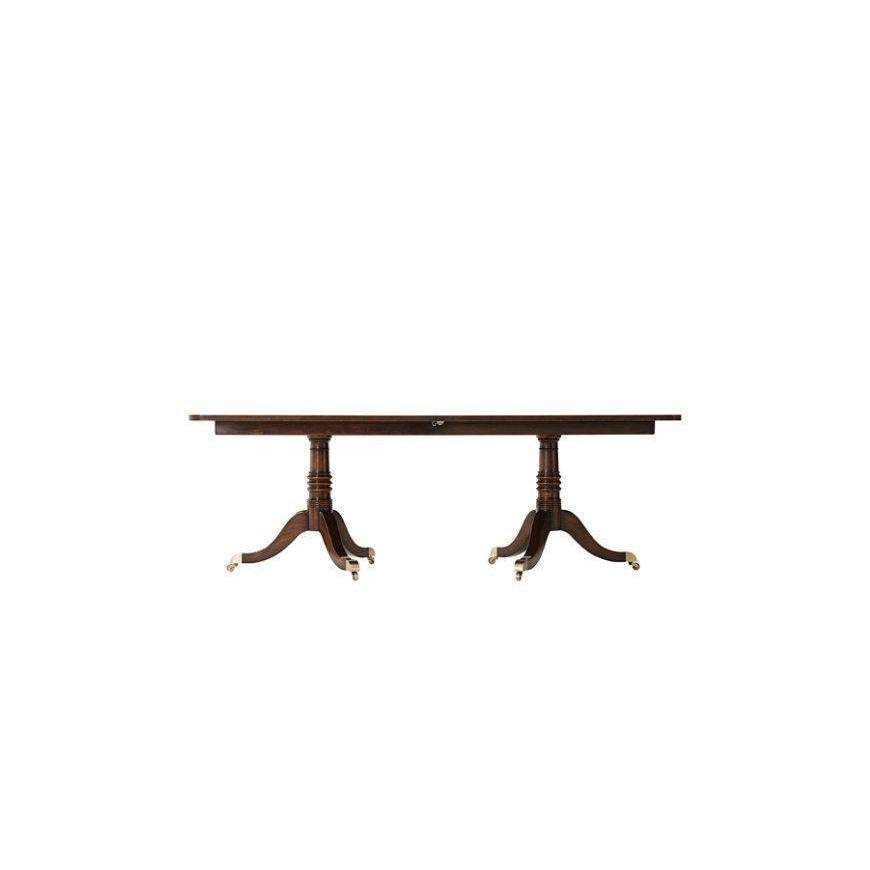 A swirl mahogany veneered dining table, the rectangular reeded edge and satinwood banded top extending to accommodate one additional leaf, on two gun-barrel turned column pedestals with downswept legs terminating in brass cappings and castors. Inspired by a Regency original.