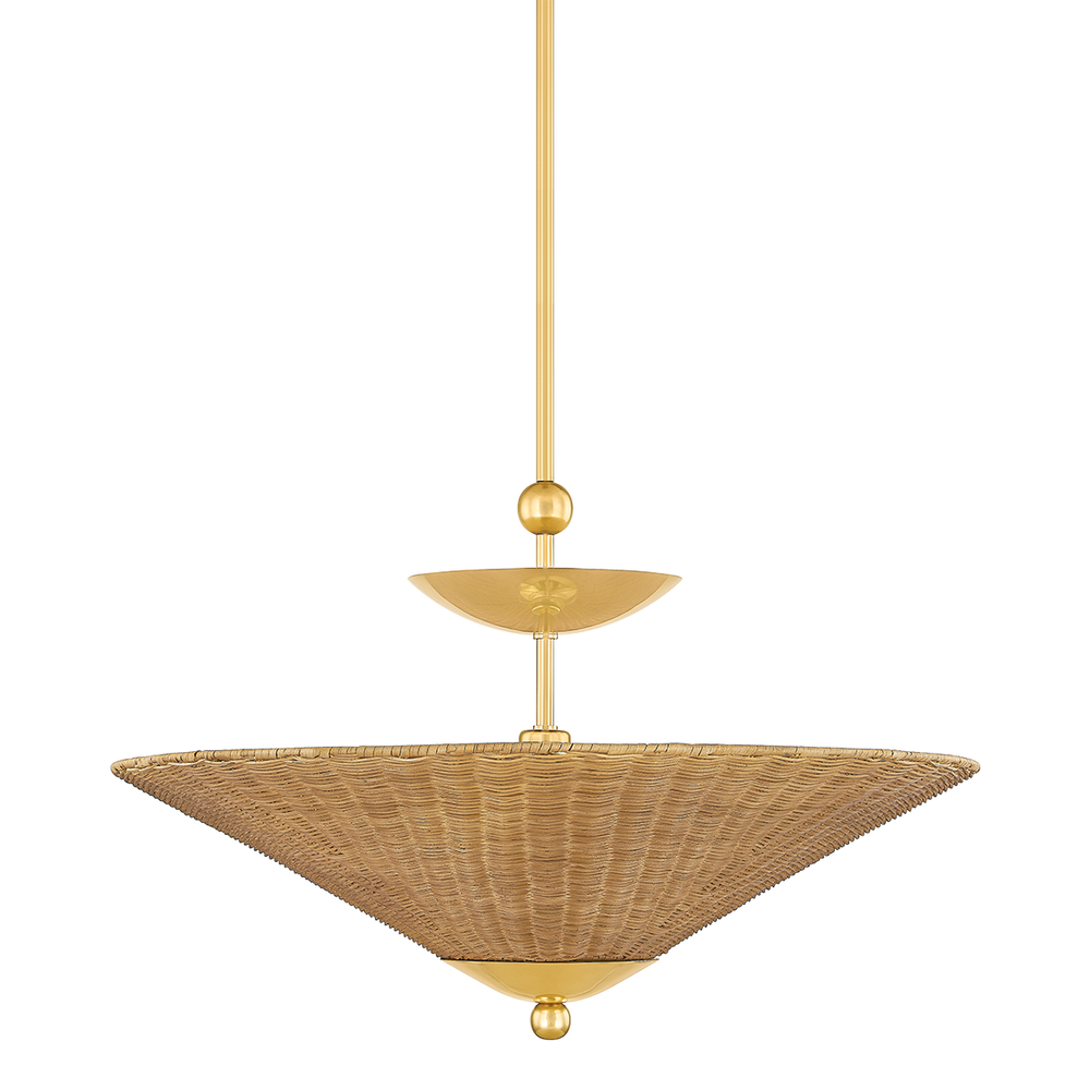 Description: Playing with shapes, texture, and light, Perilla creates modern geometries from a surprising mixture of materials. The elongated frame supports stacked forms that culminate in a textural wicker rattan shade. Decorative sphere details add an artisanal touch to the design. Perilla is available as a pendant, table lamp, or wall sconce in two finishes, Aged Brass and Old Bronze. Part of our Dabito x Mitzi Tastemakers collection. *Due to the one-of-a-kind nature of the medium, exact colors and patterns may vary slightly from the image shown.