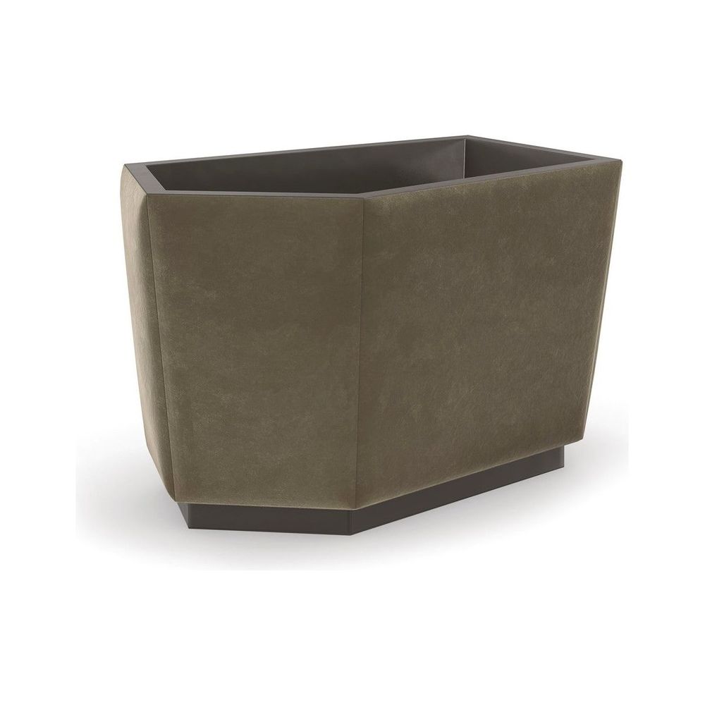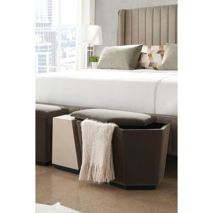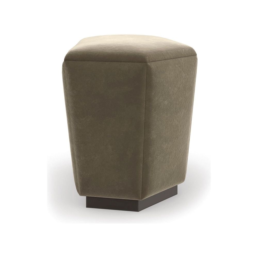 An artful integration of form and function, this faceted storage ottoman is named for one of the Gemini twins in Greco-Roman mythology. Upholstered in a luxuriously soft mohair fabric, its sculptural silhouette is balanced on a Dark Chocolate plinth base. Style on its own in a living room or conversation nook, or pair with Pollux and Gemini, our faceted spot table, for chic end-of-bed storage and plush seating option.