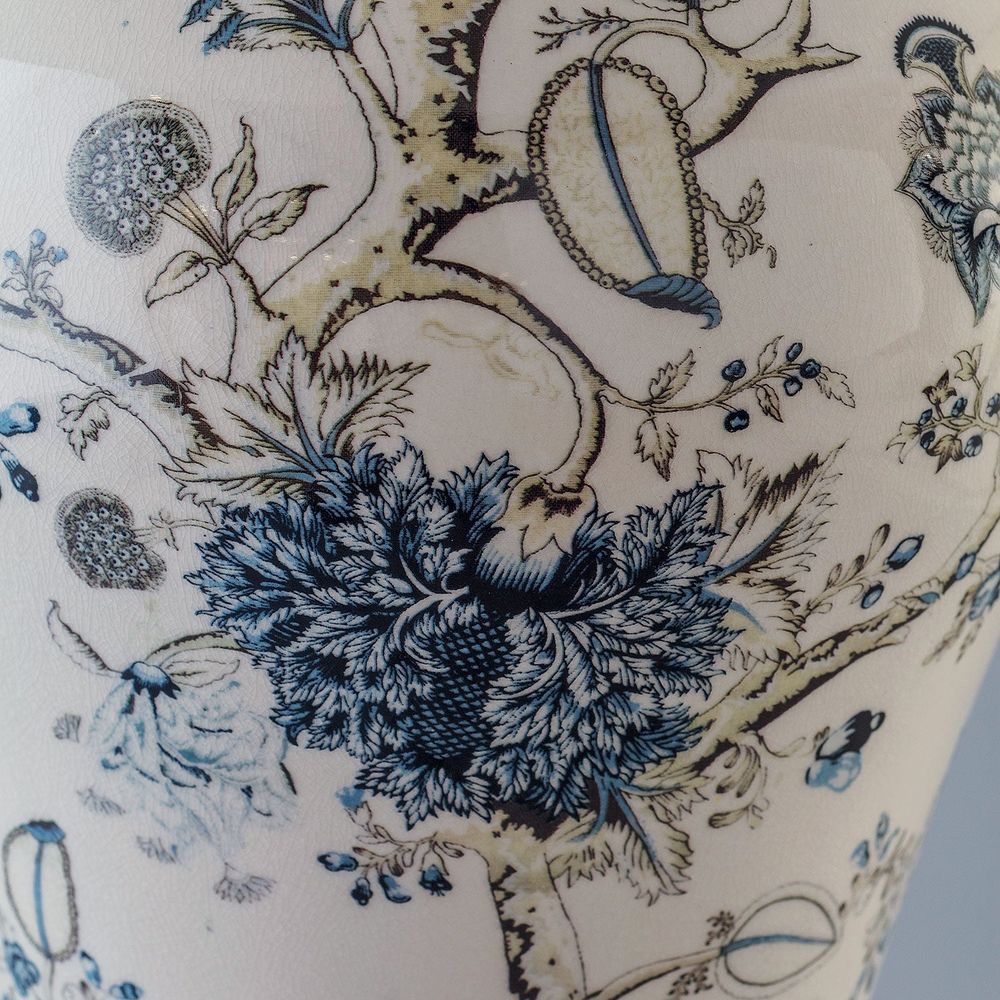Palampores or tree-of-life patterns have origins in India, where the exotic designs were hand painted and mordant dyed--then exported to Europe and England for use as elaborate bed hangings and curtains. Scalamandre's timeless tree-of-life print, Pondicherry, is offered in rich blues on cream crackled porcelain for today's classic interior.