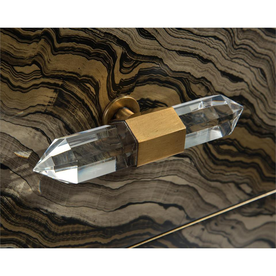 A three-drawer oak chest in black has gold cerusing. The drawer fronts are a hand-painted faux marble pattern of taupes and gold, furnished with brass and crystal prism-shaped handles. The case is set on a steel base finished in antique brass.