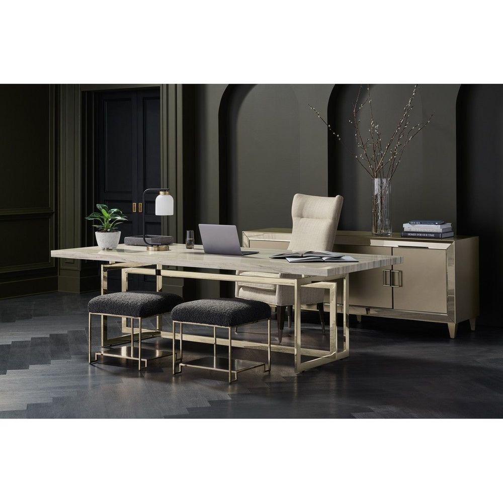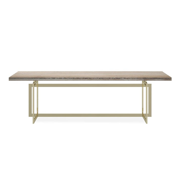 Because not all dining rooms are created equal, there's the Wish You Were Here table. An extraordinary example of organic luxe, it offers an ultra-impressive 100-inch tabletop of gray sandstone. Earthy tones meld with greiges and soft grays to create a visual that's sleek and modern while still feeling warm and natural. A bold, open geometric base finished in Whisper of Gold creates a mix of materials and brings in the glamour. With a dining room table this stunning, you'll hesitate to cover it!