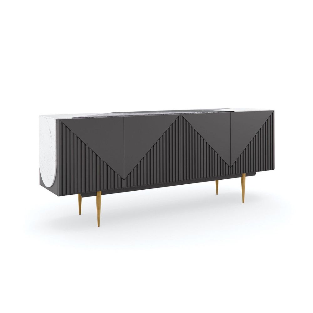 Bring a modern form to traditional dining with our Over the Edge buffet, finished in Warm Slate and a mix of polished marble and stone. Graphic slat details add dimension to this contemporary design, balanced on tapered metal legs in Champagne Gold. Perfect for happy hours and hosting, it offers generous storage with two drawers, adjustable shelves and open space, neatly concealed by touch-latch doors. Or, style as a statement-making console in living rooms, halls, and entryways.