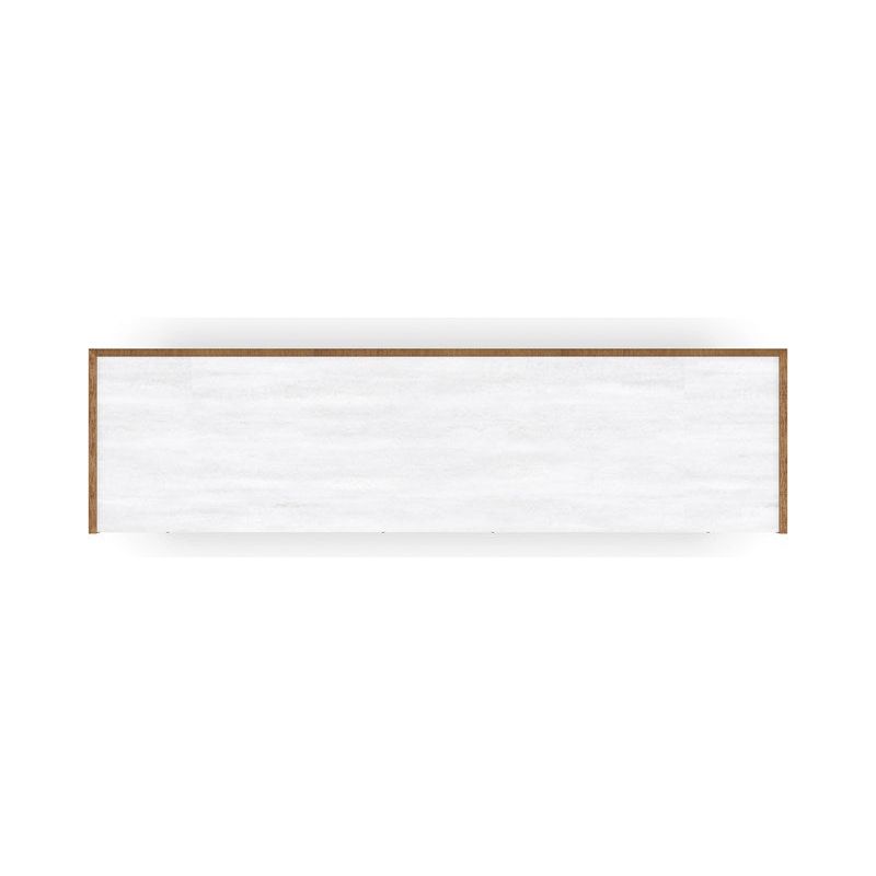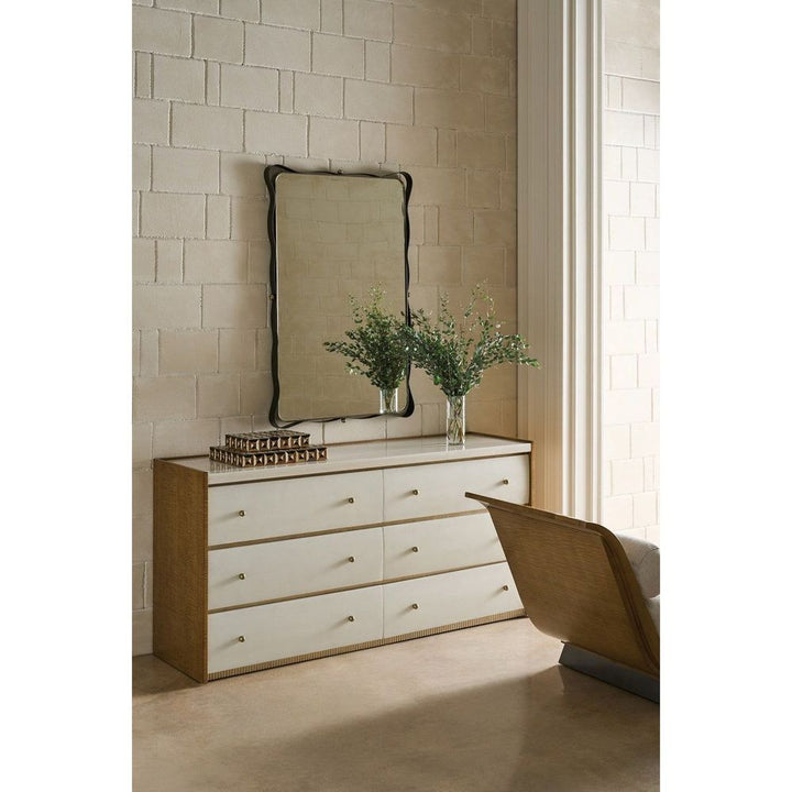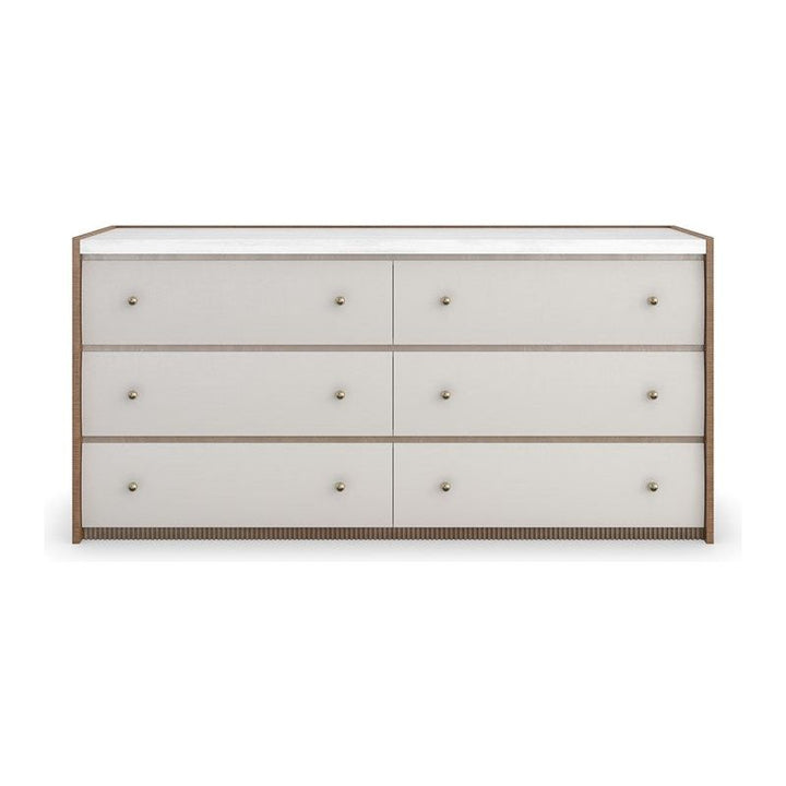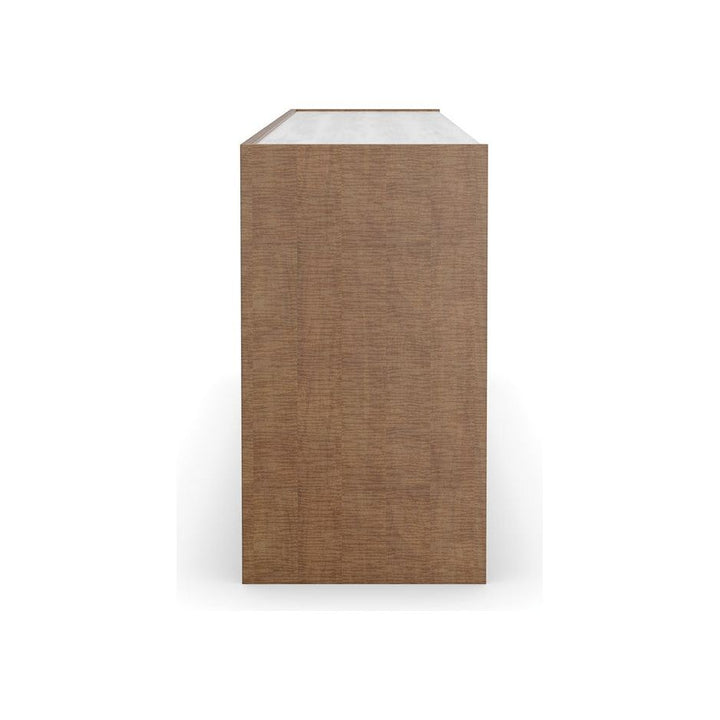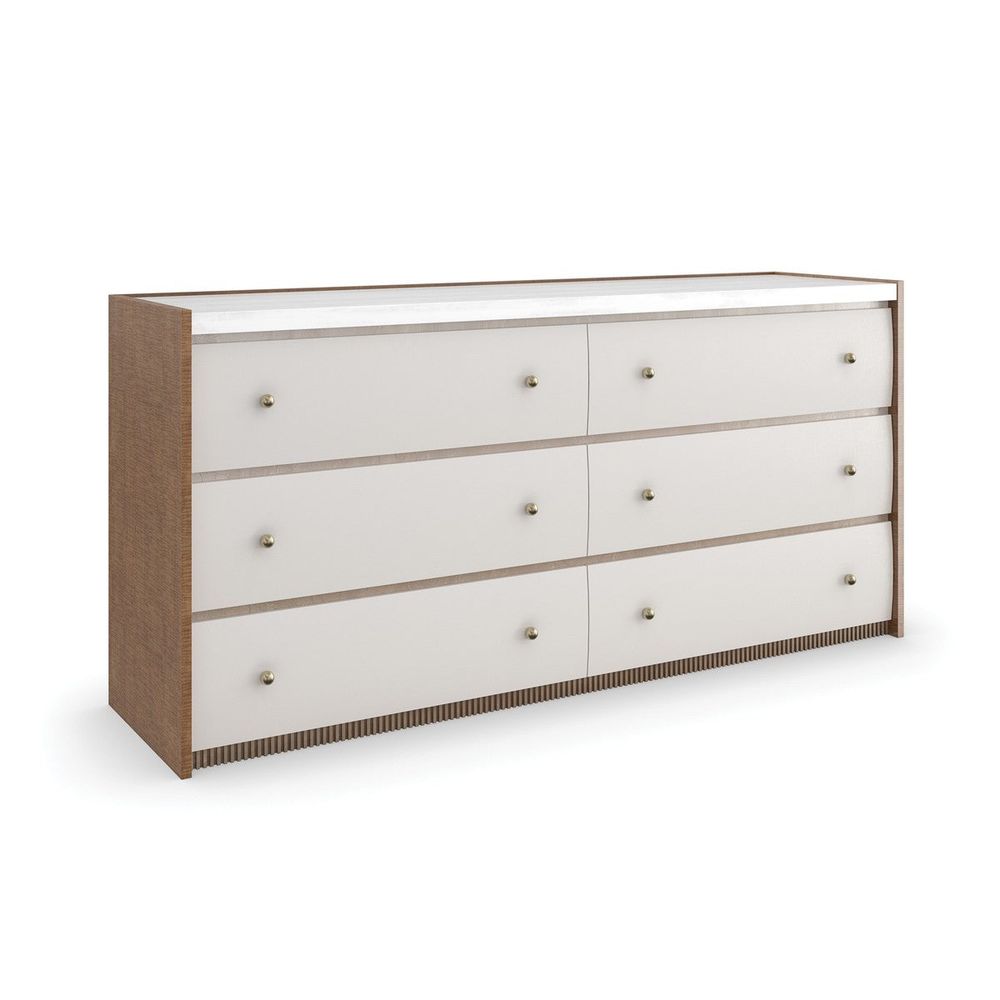 With a rustic elegance reminiscent of rural France, this dresser features tactile drawer fronts in a Rockport Burnished Adobe finish. Drawing the eye to its architectural design: a striated white onyx marble top, warmly contrasted by end panels in Toasted Sycamore and an Antique Bronze Leaf dentil molding detail along the base. Features six spacious drawers with painted interiors and ball hardware in Brushed Gold for an accentuating element that ties it to our Provence bed.