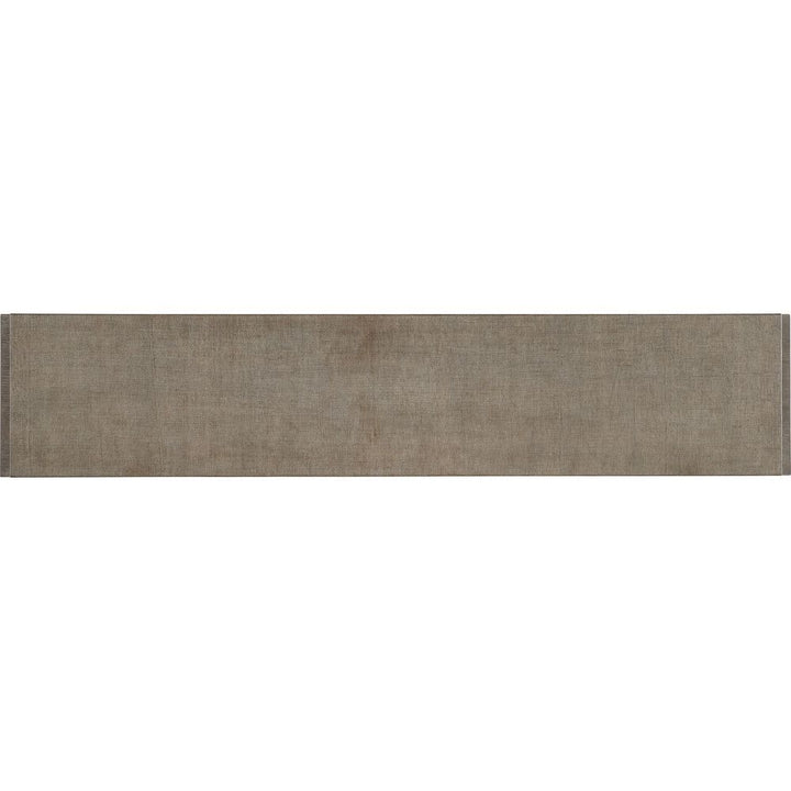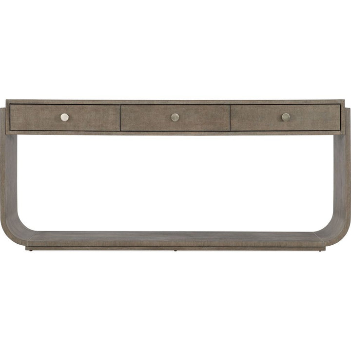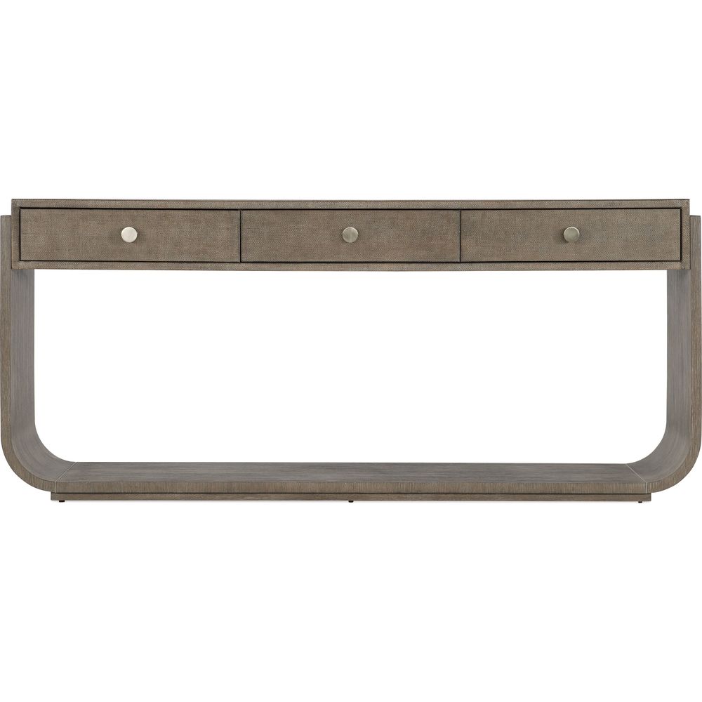 Description: Symmetrical and timeless with a luxe mixture of materials, the soft and sophisticated Pulse Console Table has a narrow rectangle shape with rounded sides and a raffia-wrapped drawer front and top. Crafted of Quartered Oak Veneers with wire-brush detailing, it is finished in the dark Mink finish, accented by round knobs in a warm pewter finish wrapped in leather.