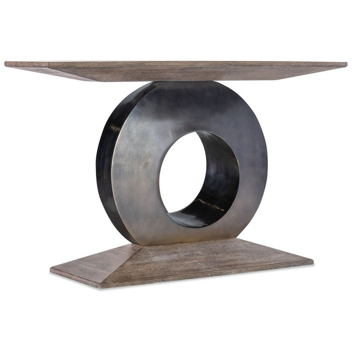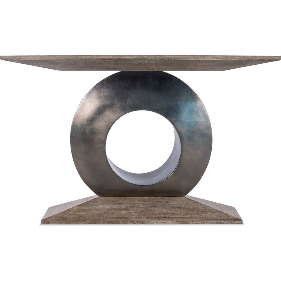 Description: Bold, organic and geometric, the Pulse Accent Table has a rectangular shape with a dramatic metal-wrapped circle base. Crafted of Quartered Oak Veneers and resin, it is finished in Mink, featuring wire-brush detailing with dark, earthy brown hues with notes of black for a soft sophistication.