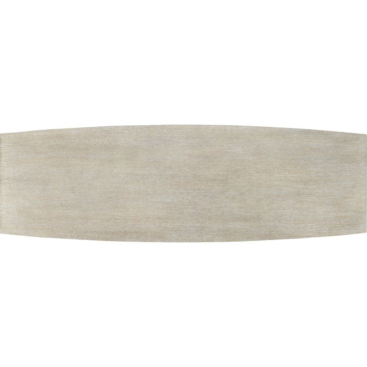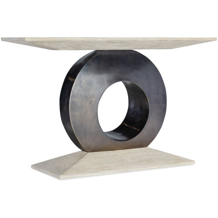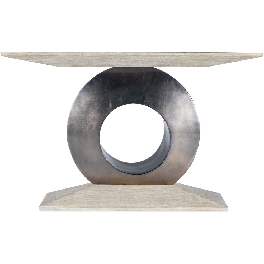 Description: Bold, organic and geometric, the Pulse Accent Table has a rectangular shape with a dramatic metal-wrapped circle base. Crafted of Quartered Oak Veneers and resin, it is finished in Diamond, featuring wire-brush detailing with crystal-like alabaster and pewter hues for a soft sophistication.