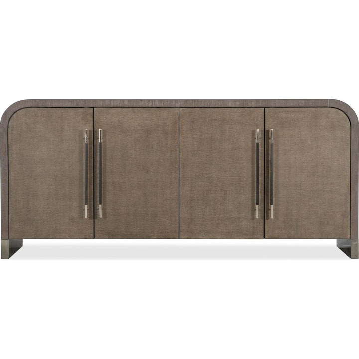 Description: Sleek and stunning with a timeless sophistication and soft modern aesthetic, the Pulse Buffet combines Quartered Oak Veneers with raffia-wrapped doors, warm pewter brushed metal bar pulls accents. The Mink Finish has dark, earthy brown hues with notes of black, offering a serene style. Features include 4 doors with soft-close hinges and magnetic catches, two adjustable wood shelves behind each pair of doors, ventilated back panels and wire management holes in the back panel and a 3-plug electrical outlet behind the right-side doors.