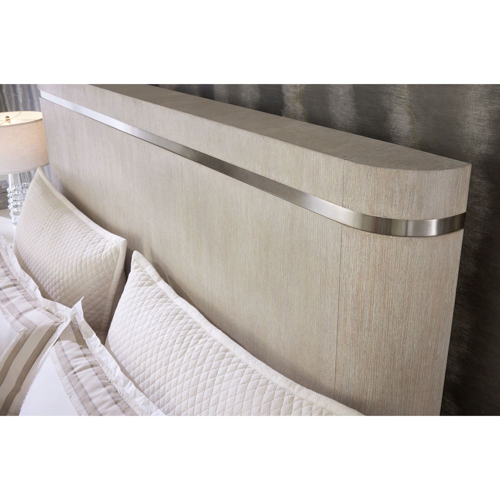 Description: With an unmistakably modern aesthetic that transcends time, the stunning Pulse Panel Bed has warm pewter-finished metal inlay trim in the headboard and metal-wrapped feet on the footboard, contrasting with the wire-brushed crystal-like Diamond finish on the Oak Veneer frame. Includes the headboard, footboard and rails.