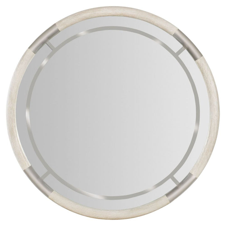 Description: In a timeless compass-like profile, the Pulse Round Mirror combines Quartered Oak Veneers in the Diamond finish with wire-brush detailing and warm pewter metal accents for a striking focal-point piece.