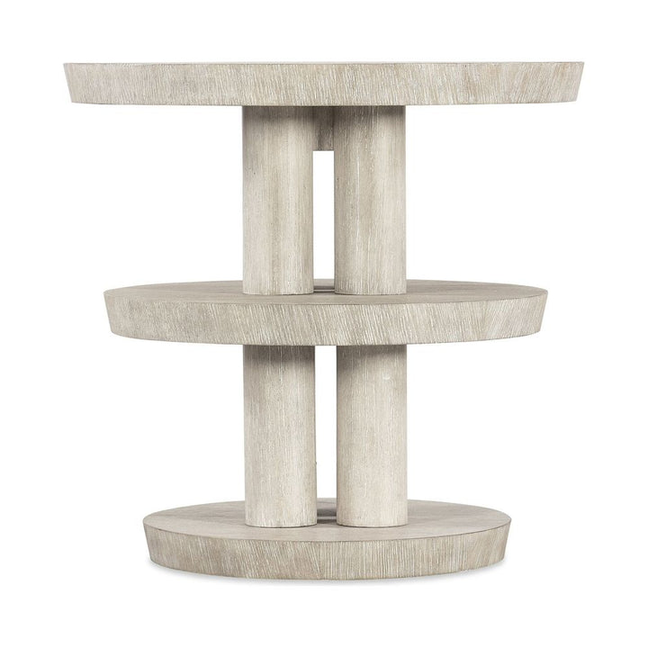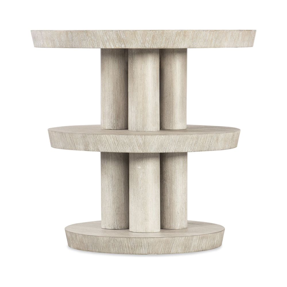 Description: With a casual, natural, almost primitive look, the Pulse Round Side Table is a three-tiered design with three round columns as the base. Crafted of Oak Veneers with wire-brush detailing for a tactile appeal, the table features the Diamond Finish with crystal-like alabaster and pewter hues, delivering a soft sophistication.