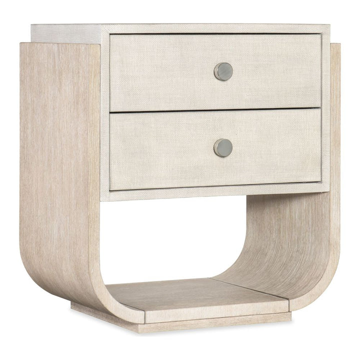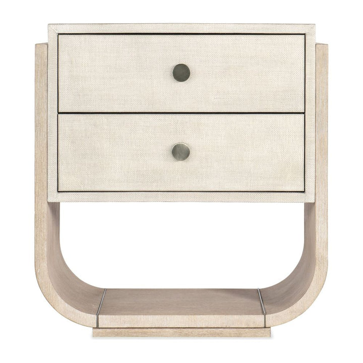 Description: Symmetrical, monochromatic and timeless with a luxe mixture of materials, the Pulse Two-Drawer Nightstand is a statement piece. The case is crafted of Oak Veneers in a wire-brushed Diamond finish, the drawer fronts and top are wrapped in raffia and trimmed in metal with warm brushed-nickel knobs. Drawers are smoothly-operating and self-closing.