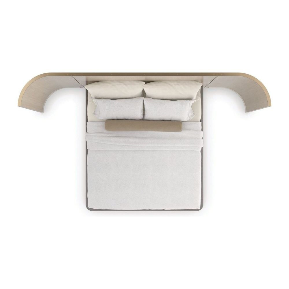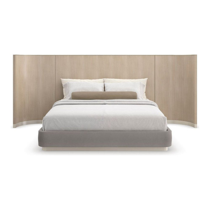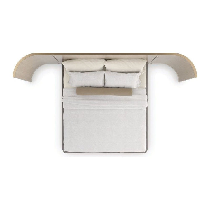 Rich in material, yet restrained in form, the Dream Chaser bed lends an understated balance of opulence and simplicity. A Dry Martini finish draws attention to its parsons-shaped headboard, crafted from exquisite Koto veneers and encased in Brushed Gold. Wood-paneled wings with a subtle curvature add to its warm and welcoming aesthetic, complemented by a softly rounded footboard and side rails in a pale gray mohair fabric. Also available without wings.