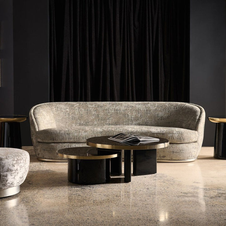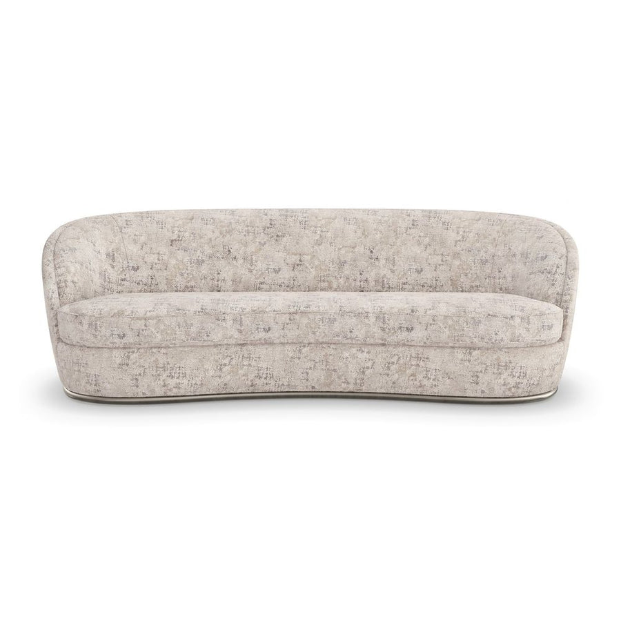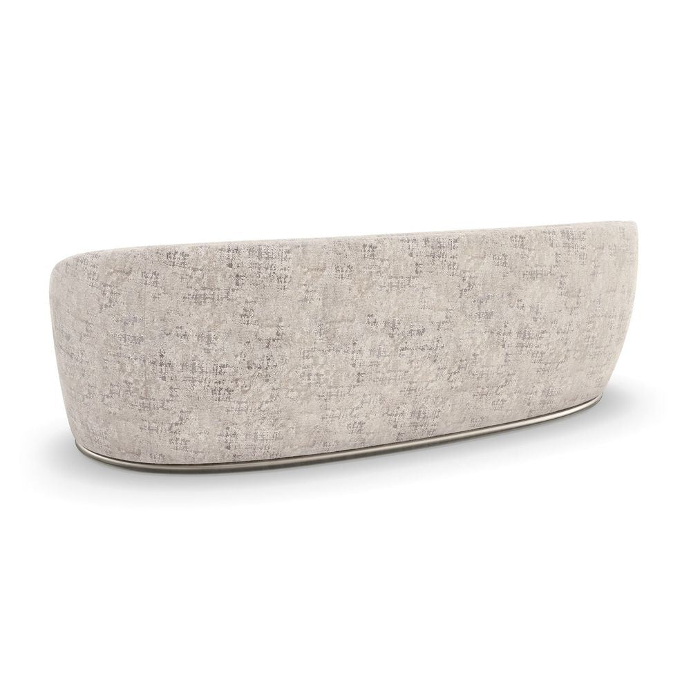 Soft and sculptural with a hint of shimmer, this biomorphic-style sofa evokes the senses and introduces an effortless elegance. Balanced on a rounded Charcoal Leaf wood base, its enveloping silhouette is defined by a double-roll detail along the top for a continuous curving line that guides the eye. Tailored in a tactile chenille fabric for a look that invites comfort and luxury.