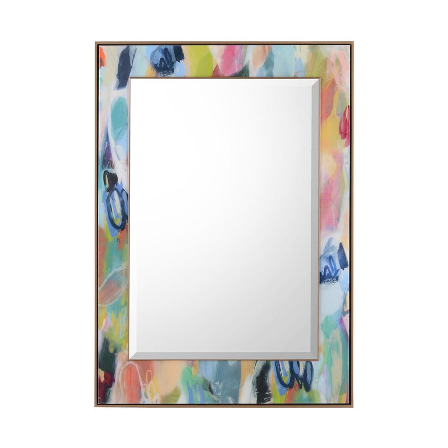 This mirror featuring Date Night by artist Rachel Poe is a unique design where wall art is converted into a mirror. Date Night is a fun and colorful pop of color that brings this mirror to life. The canvas surrounding the modern b