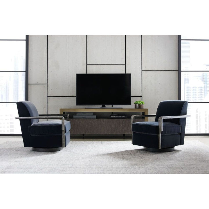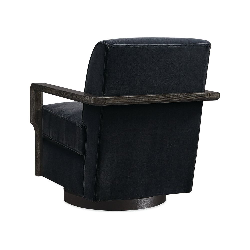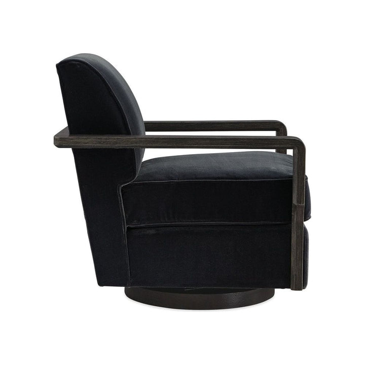 When it's time to relax and unwind in undeniable style, this is your chair. Its bold character was inspired by the svelte lines and powerful presence of an art-deco roadster chair. This open-arm swivel chair has a notched back to hold the cushion in place and ensure its stylish comfort while exposed wood arms wrap around the back in a seamless racetrack design. Its metal swivel base features a Remixed Gold Paint finish. Only a design as unique and distinctive as this Rewind chair can help you find a sense of adventure in the everyday.