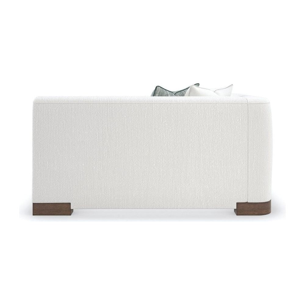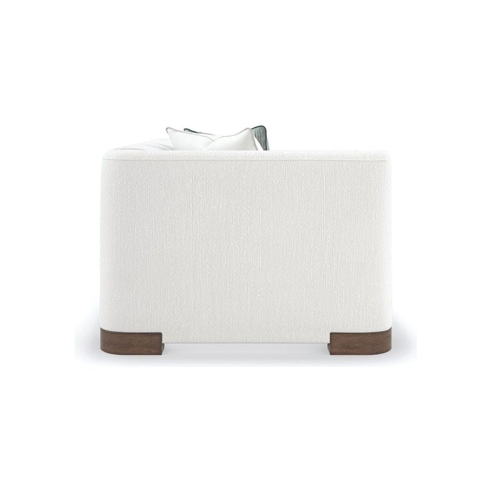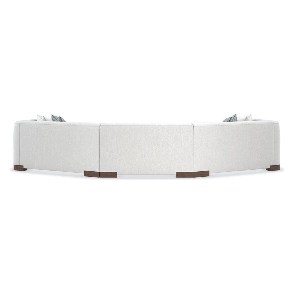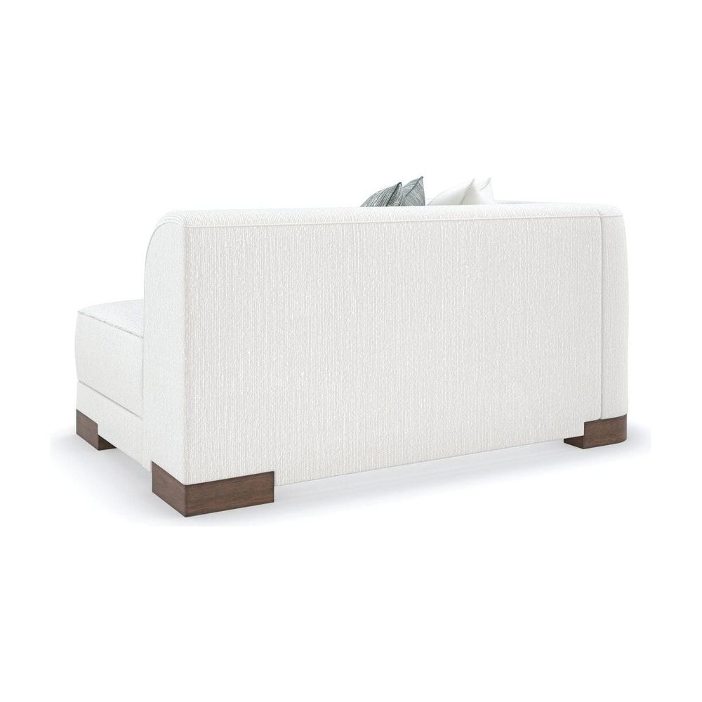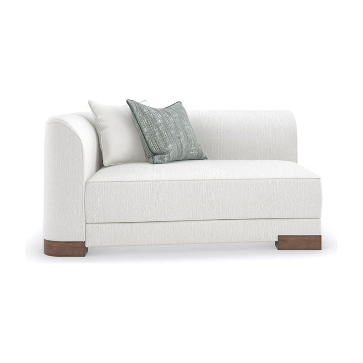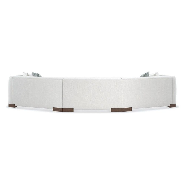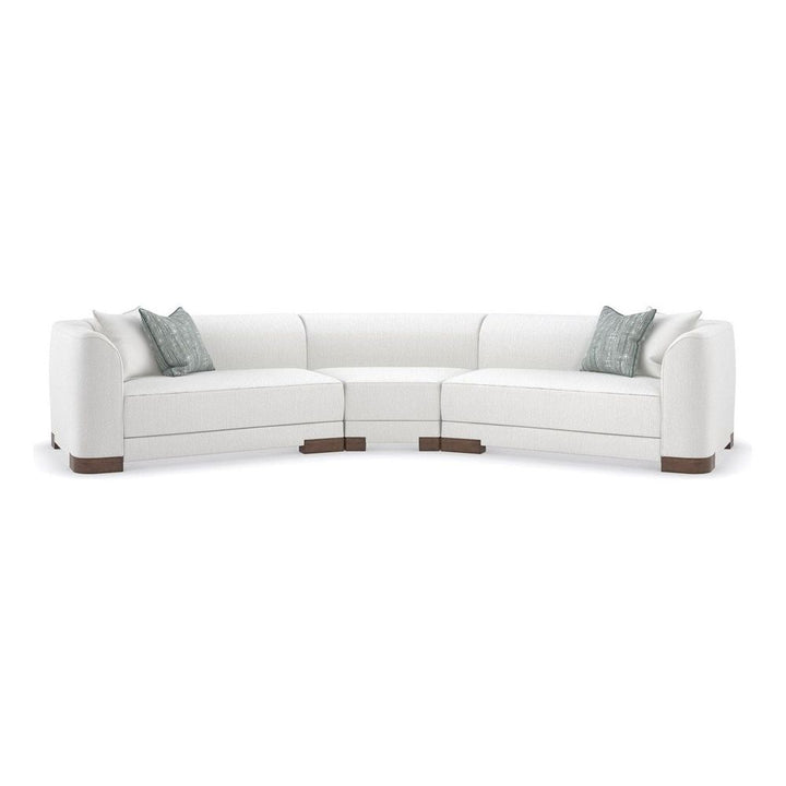 With multiple configurations to create a luxury lounging experience, this modular sectional sets a tranquil tone in a softly textured chenille performance fabric. Balancing clean lines with a subtle curve and rounded edges, its smooth silhouette rests on exposed wood feet in a warmly contrasting French Roast finish. Accent pillows add a tactile finishing touch in an aqua ottoman weave and a tone-on-tone woven geometric.
