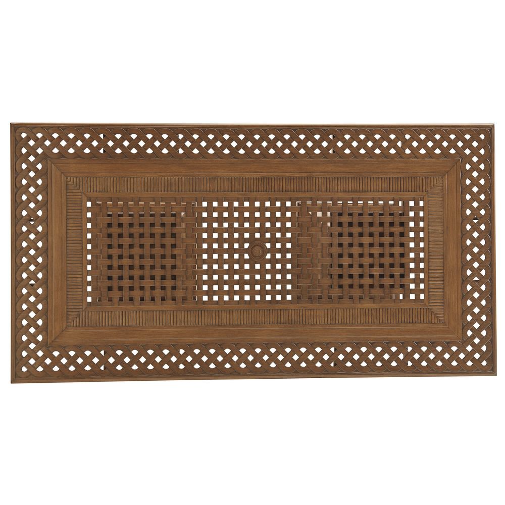 Feature 1: The hand-applied dry-brushing effect on the aluminum surface is just one of the notable details on the dining table. The cast top has a basket weave center, a braided perimeter, and what appears as sliced bamboo within a mitered rectangular frame. At the center is a removable monogrammed insert for an umbrella pass-through. The stately double pedestal base is attractive is the ideal support, but is also designed to accommodate the umbrella stand. However the removable monogram is attractive as the center of the top surface when choosing not to use an umbrella. Consists of 3935-877CT and 3935-877TB.