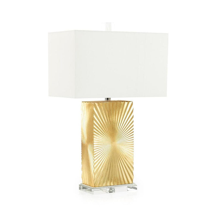 The Reina Table Lamp is a stunning design statement, infusing a space with opulent tones and intricate textures. The body showcases a stylish gold tone with a radiant sunburst pattern on all sides, elevated through Silver Leaf accents matching hardware in Polished Nickel. A rectangular base of clear crystal and matching finial complete the look of this table lamp with a three-way switch.