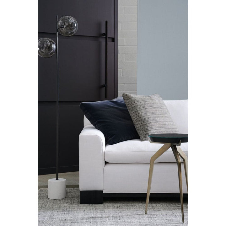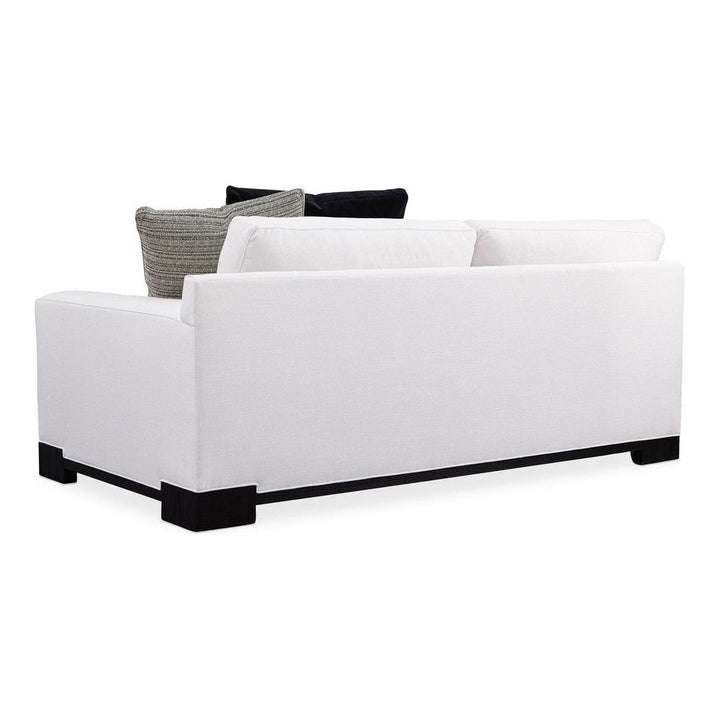 Features: Curved track arm.Slim wood base with block feet.Loose seat and back cushions.