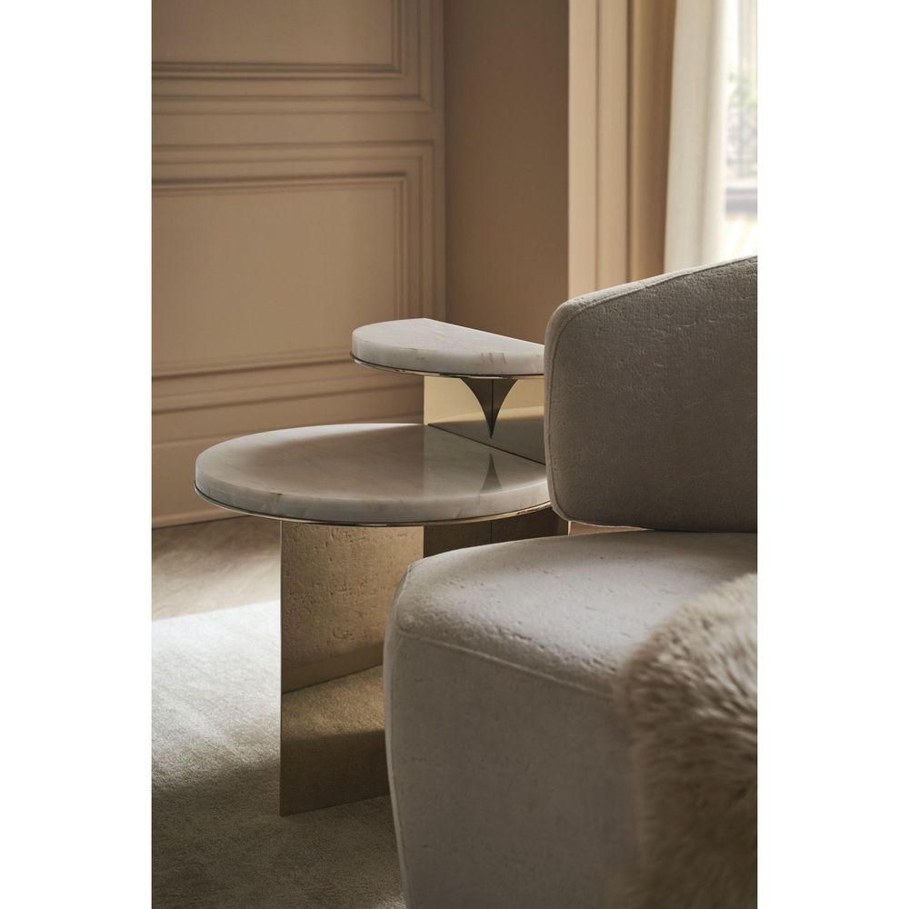 Simple yet elegant with an emphasis on function, this curved end table adds depth and reflection to seating areas. Features two tiers of White Rhino stone atop an angular metal base finished in a Whisper of Gold. A standout on its own, even more memorable in pairs.