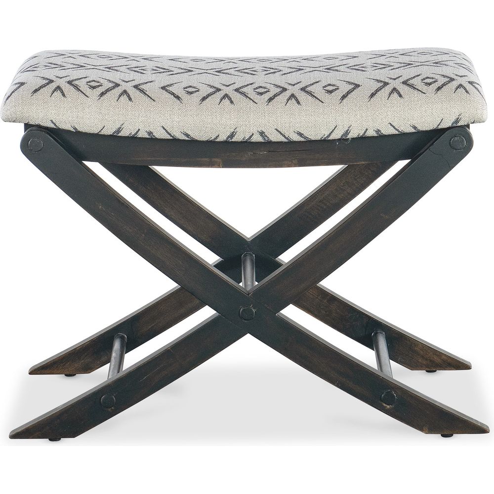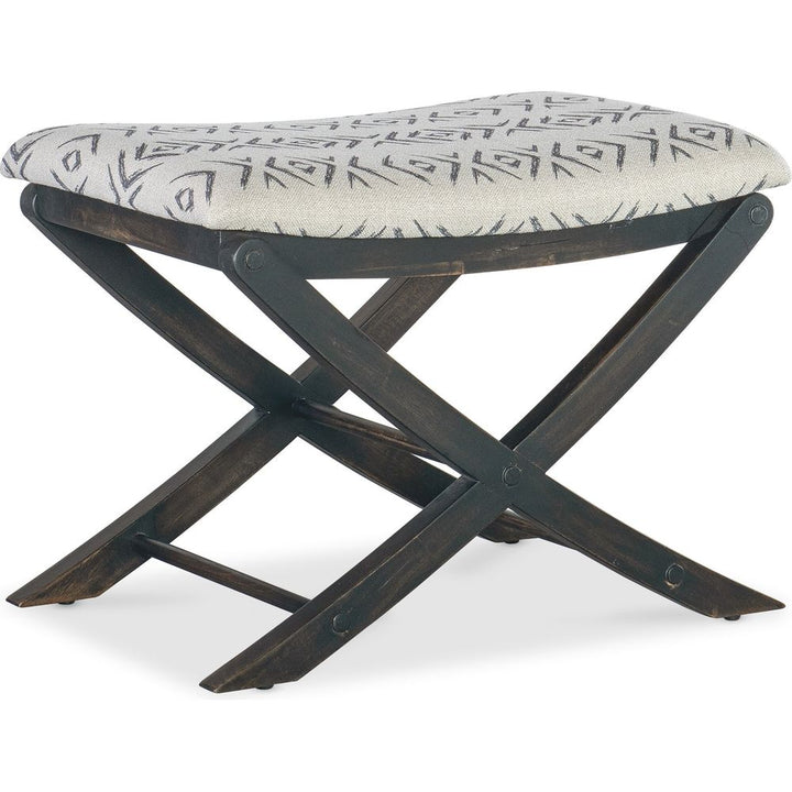 Description: Tropical meets tribal with this Retreat Camp Stool Bed Bench. Featuring a seat upholstered in the patterned Jafar Grey, it has an X-base design. The base and stretcher are crafted of wood finished in the Black Sand finish, transparent by design to showcase the unique grain patterns of the wood veneer.