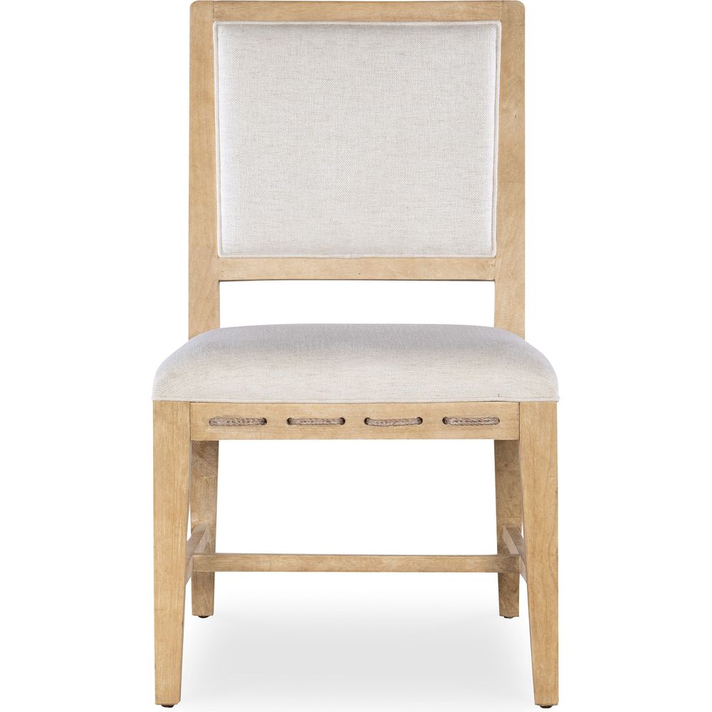 Description: Island Oasis meets Organic Modern in the Retreat Raffia-Back Side Chair. In a mixture of natural materials including wood, raffia cane, rope and fabric, the armchair is comfy and chic. The seat and back of the chair is upholstered in the Wiley Snow neutral performance fabric, and the seat apron features rope trim. The back of the chair is covered in raffia cane, and the chair frame, stretcher and legs are finished in the sand-colored Dune, transparent by design to reveal the unique grain patterns of the veneer.