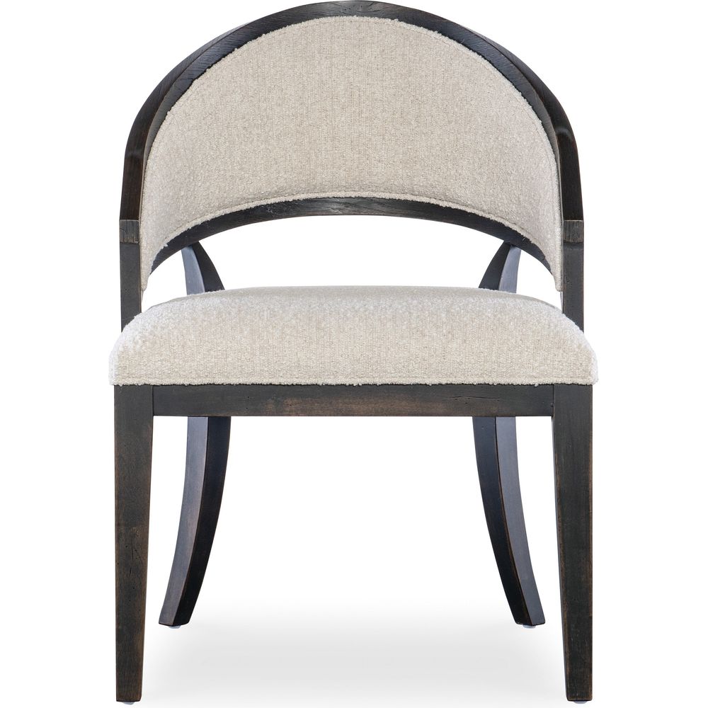 Description: Offered in a modern yet timeless barrel-style back silhouette, the versatile Retreat Chair combines wood, cane and fabric in a chic organic design. The chair frame is finished in the Black Sand finish, complemented by the Neo Cream performance fabric on the upholstered seat and back and raffia cane on the back of the chair back.