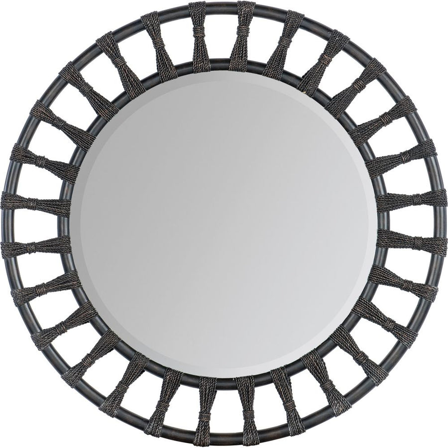 Description: Inspired by tropical getaways and island locales, the Retreat Pole Rattan Accent Mirror features an inner and outer wood circle connected by rope accent ties. It is finished in Black Sand, transparent by design to showcase the unique grain patterns of the veneer.