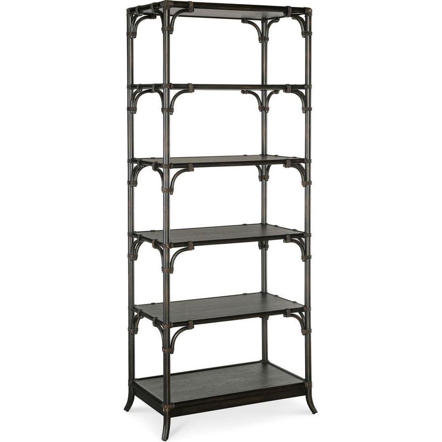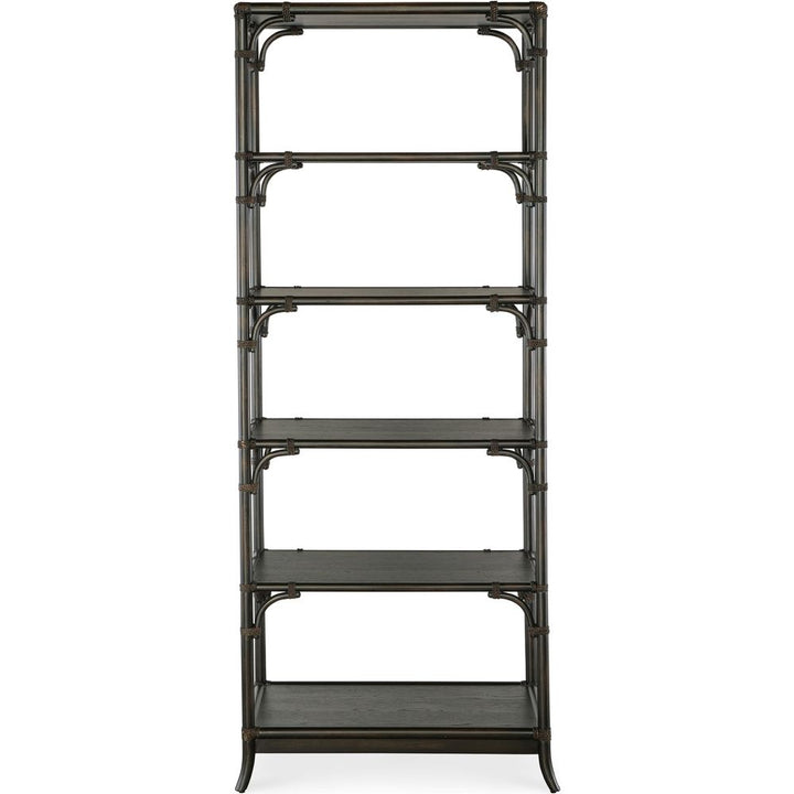 Features: Five fixed shelves; Finished on all sides; Levelers; Bamboo motif with rope accents