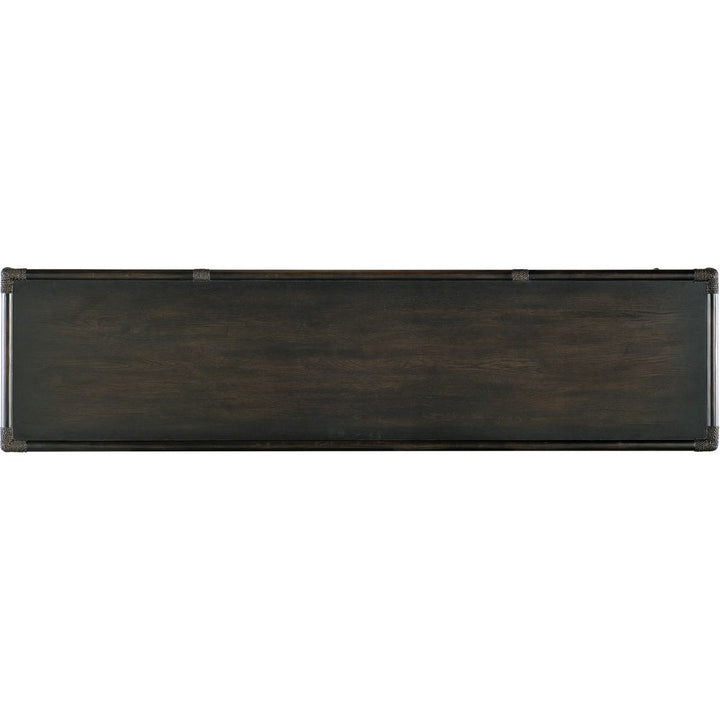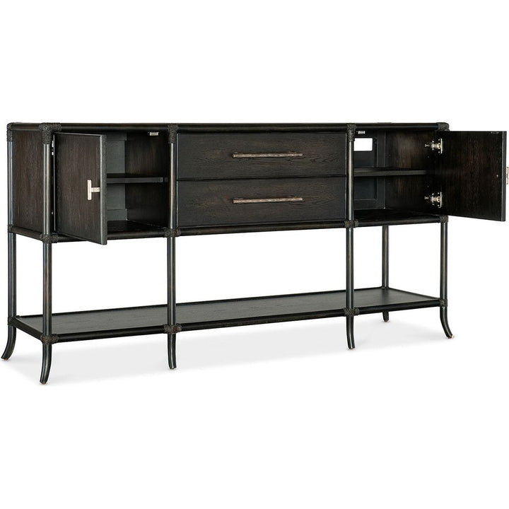 Description: With a laid-back island vibe and mix of organic materials, the Retreat Pole Rattan Sideboard is crafted of Oak and Maple Veneers with rope accents at the joints. The Black Sand finish is transparent by design to reveal the unique grain patterns of the wood veneer. Featuring ample storage, the sideboard has two doors with magnetic door catches with one adjustable shelf behind each door. There are two self-closing drawers, and the top drawer has a removable felt liner and removable silverware tray. The lower fixed shelf is ideal for display or storage. Soft pewter bar pull and "T" pulls on the doors add a distinct accent.