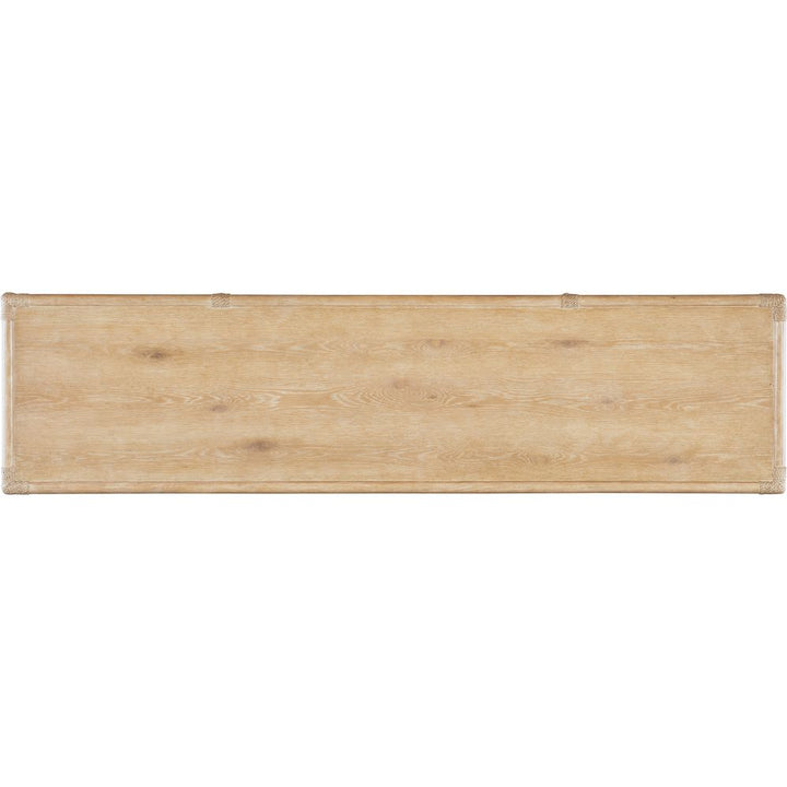 Description: With a laid-back island vibe and mix of organic materials, the Retreat Pole Rattan Sideboard is crafted of Oak and Maple Veneers with rope accents at the joints. The light sand-colored Dune finish is transparent by design to reveal the unique grain patterns of the wood veneer. Featuring ample storage, the sideboard has two doors with magnetic door catches with one adjustable shelf behind each door. There are two self-closing drawers, and the top drawer has a removable felt liner and removable silverware tray. The lower fixed shelf is ideal for display or storage. Soft pewter bar pull and "T" pulls on the doors add a distinct accent.