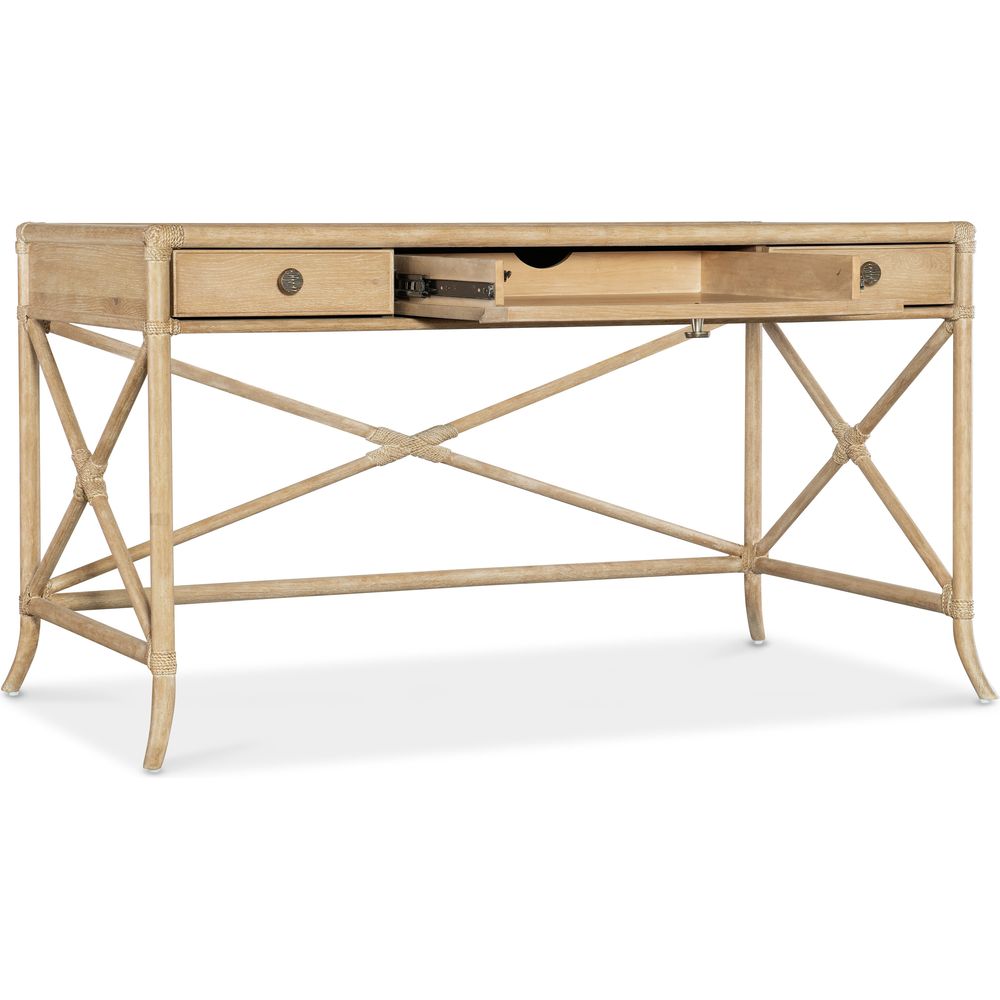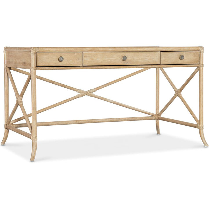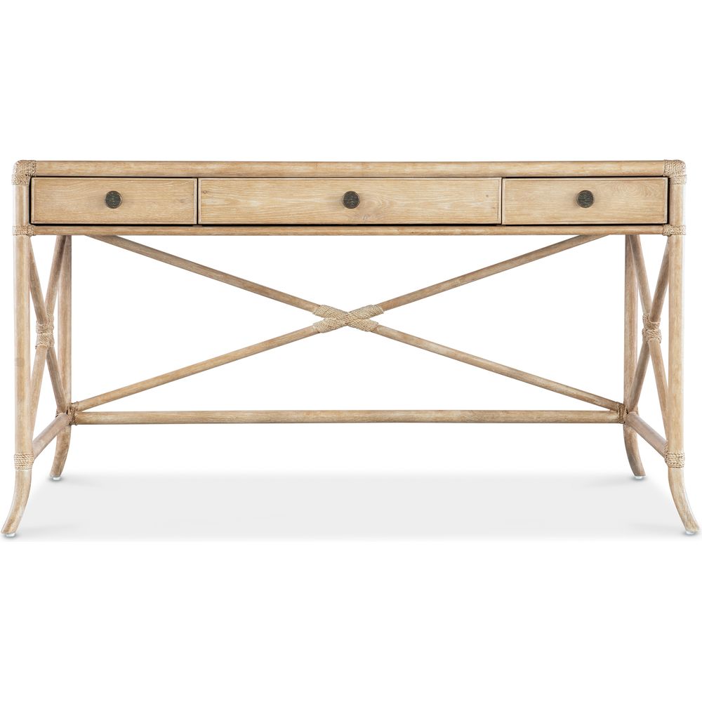 Description: With the sublime vibe of an island oasis, the Retreat Writing Desk is crafted of Oak and Maple Veneers in a Bamboo motif and accented by rope. X-design stretchers on the back and sides distinguish the piece, along with the sand-colored Dune finish, transparent by design to showcase the unique patterns of the wood veneer. Featuring three drawers, the left and right drawers have two removable dividers. One pencil tray and one writing slide may be used on either side, and the center drawer has a drop-front for keyboard use. Finished on all sides.