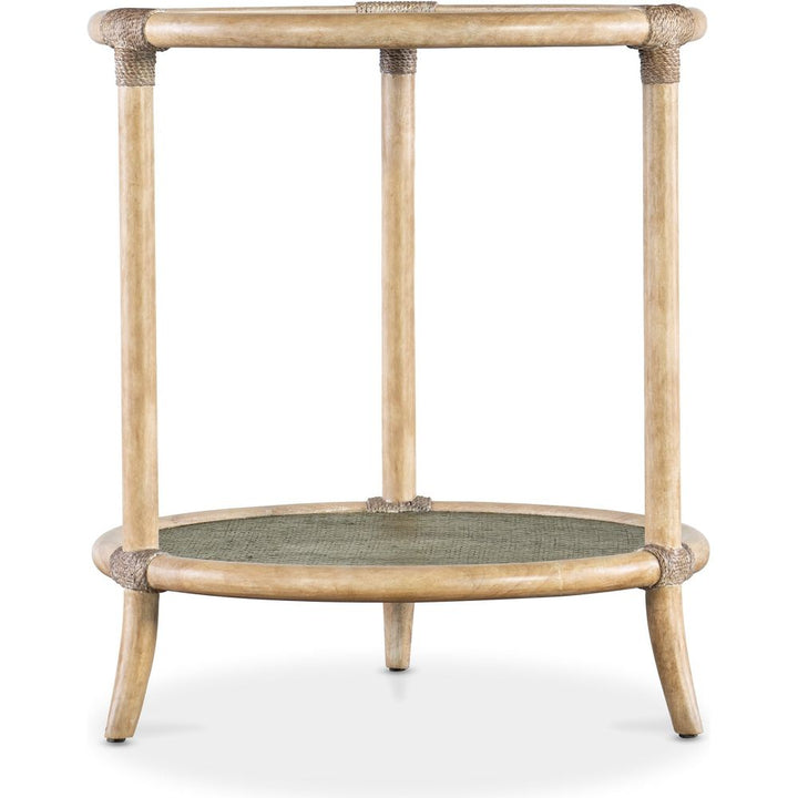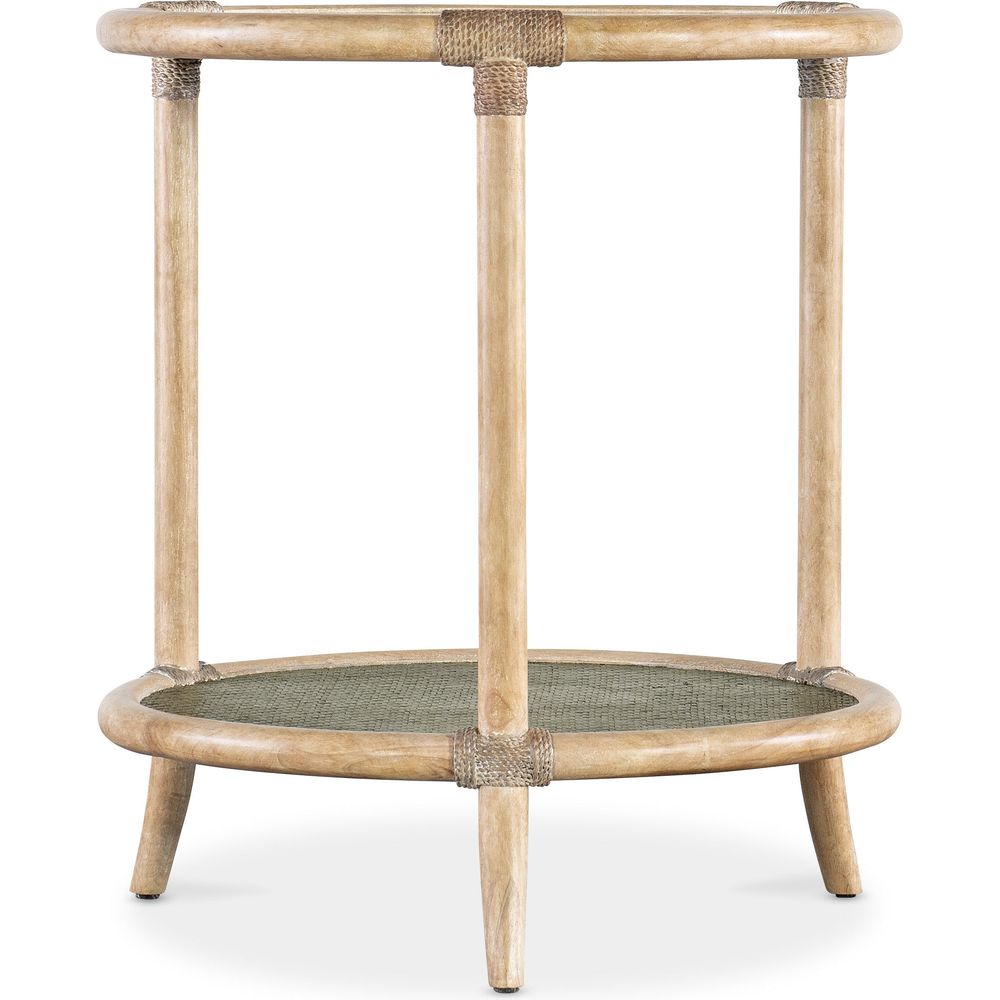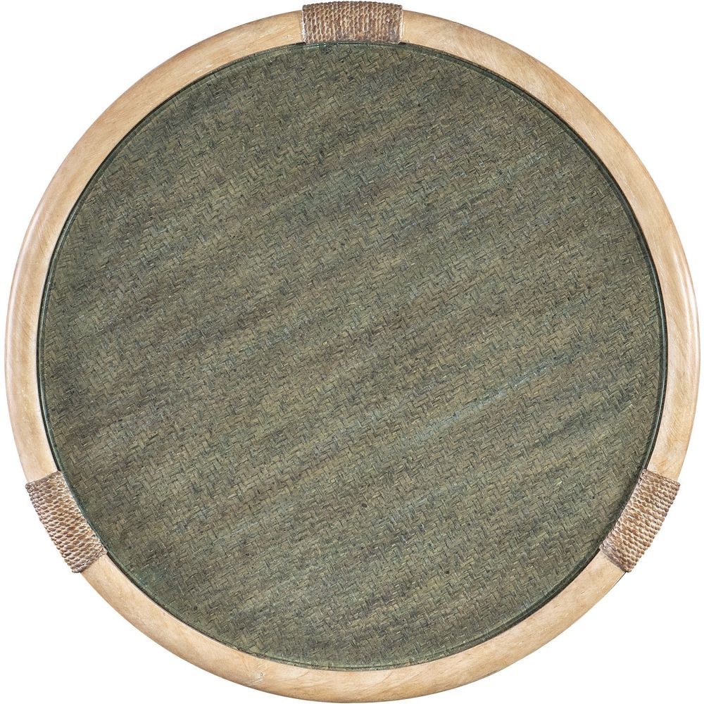 Description: Inspired by tropical getaways, the Retreat Raffia End Table is a mixture of organic materials in a laid-back and versatile design. The table combines Maple Veneers, Raffia, Rope and Tempered Glass, with a Painted Raffia top and bottom shelf in a Seagrass Green finish, a glass-top insert and Rope accents. The frame and legs of the table are finished in the sand-colored Dune, transparent by design to reveal the unique grain patterns of the wood veneer.