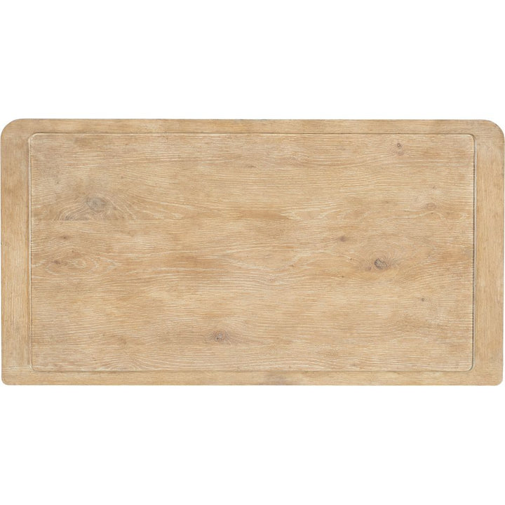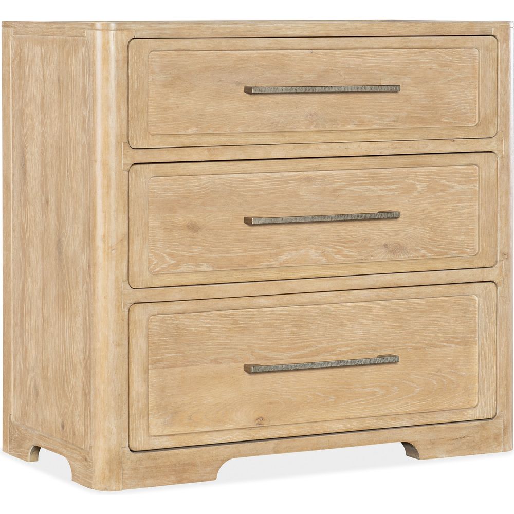 Description: The Retreat Nightstand has a tranquil personality with a modern twist and organic, textured pewter bar pulls. Crafted of Oak and Maple Veneers, it is finished in the sand-colored Dune, transparent by design to showcase the unique grain patterns of the veneer. Featuring three self-closing drawers, the nightstand is elevated on shaped block feet.