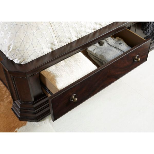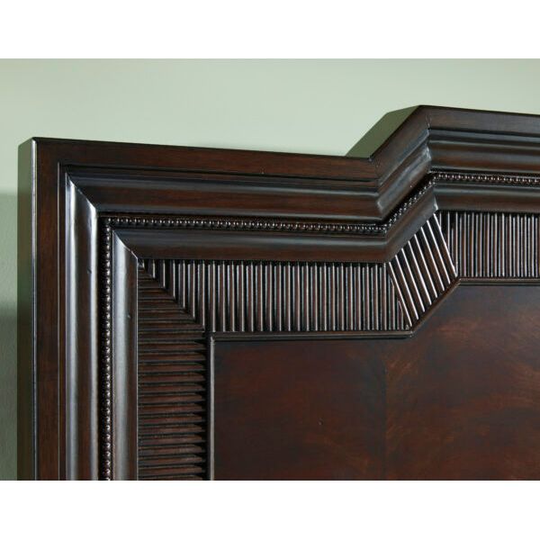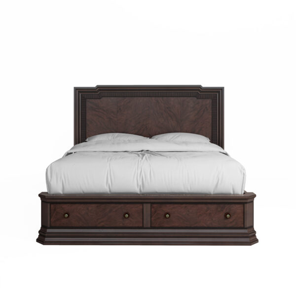 Description: A stunning blend of timeless elegance and practicality, the Revival Panel Storage Bed is crafted with precision and care, elevating the aesthetic of any bedroom with its rich finish and intricate detailing. The focal point of this bed is the headboard, featuring a mesmerizing swirl mahogany veneer pattern surrounded by heavy moldings and reeded trim. However, the footboard is not just for aesthetics; it also provides practical storage solutions with two spacious drawers. Perfect for storing extra bedding, seasonal clothing, or personal items, these drawers offer convenience without compromising on style.