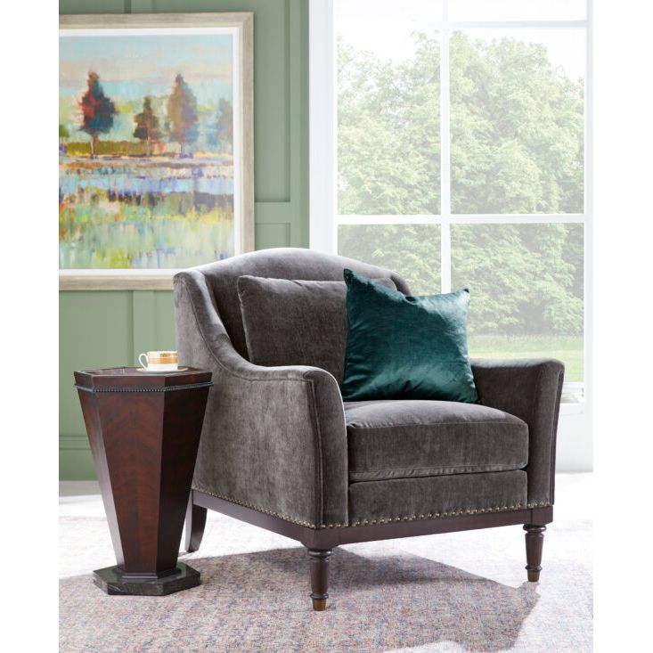 Description: The quaint Revival Spot Table may be short in size, but not in style. Featuring a tapered column silhouette that adds a touch of architectural interest and sophistication to the design, this table is perfect for pulling up next to any piece where you need a surface to set a drink, book, or snack. It boasts an inset charcoal marble top with aged brass metal trim, adding a luxurious touch. The contrasting materials and finishes create a striking visual contrast, making the table a stylish addition in any room.