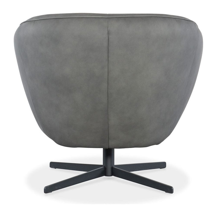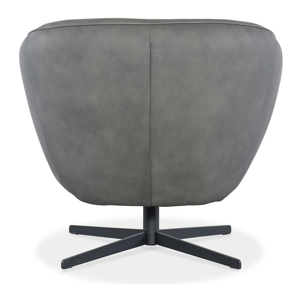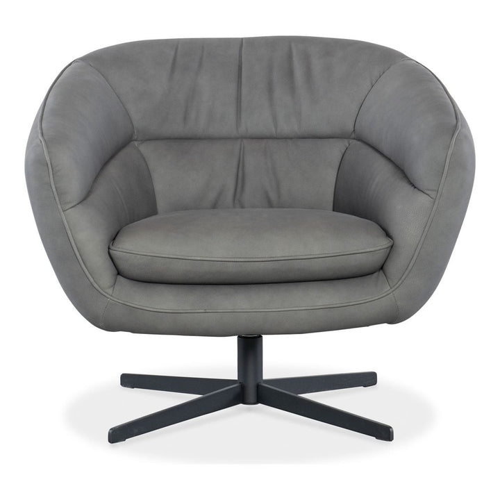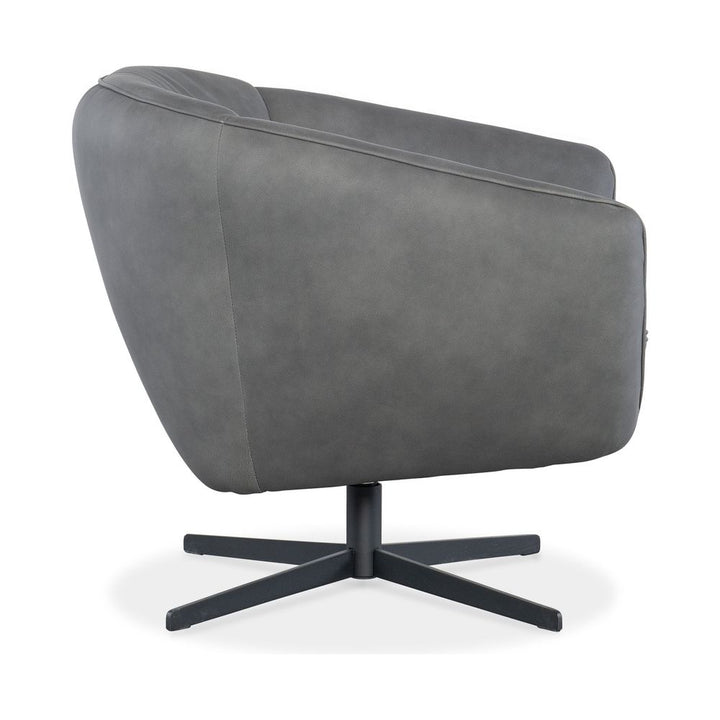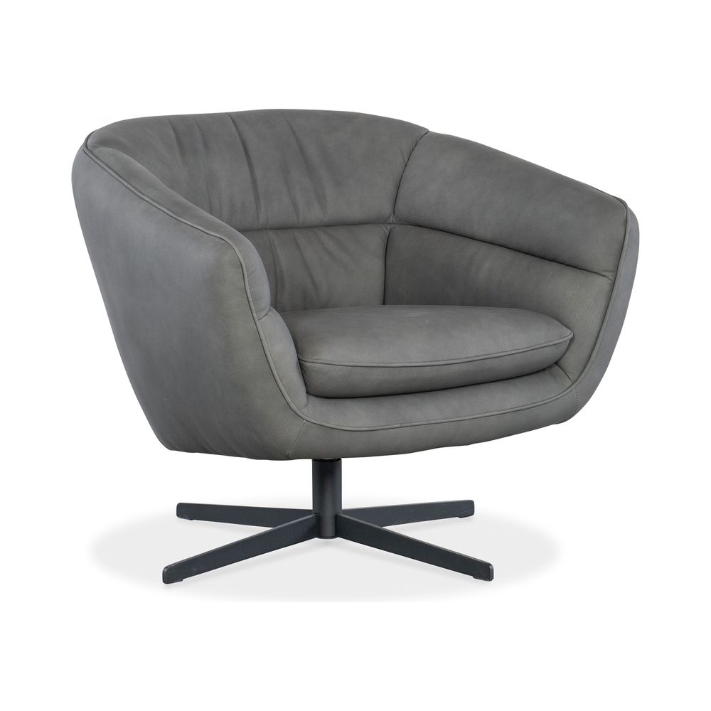 Description: Brimming with modern energy and an inviting style, the Rhea Swivel Chair features a contemporary twist on the classic barrel-back chair, along with a low channeled back and sloped arms. It is upholstered in the semi-aniline top-grain Buckskin Dark Grey leather and has a metal base.