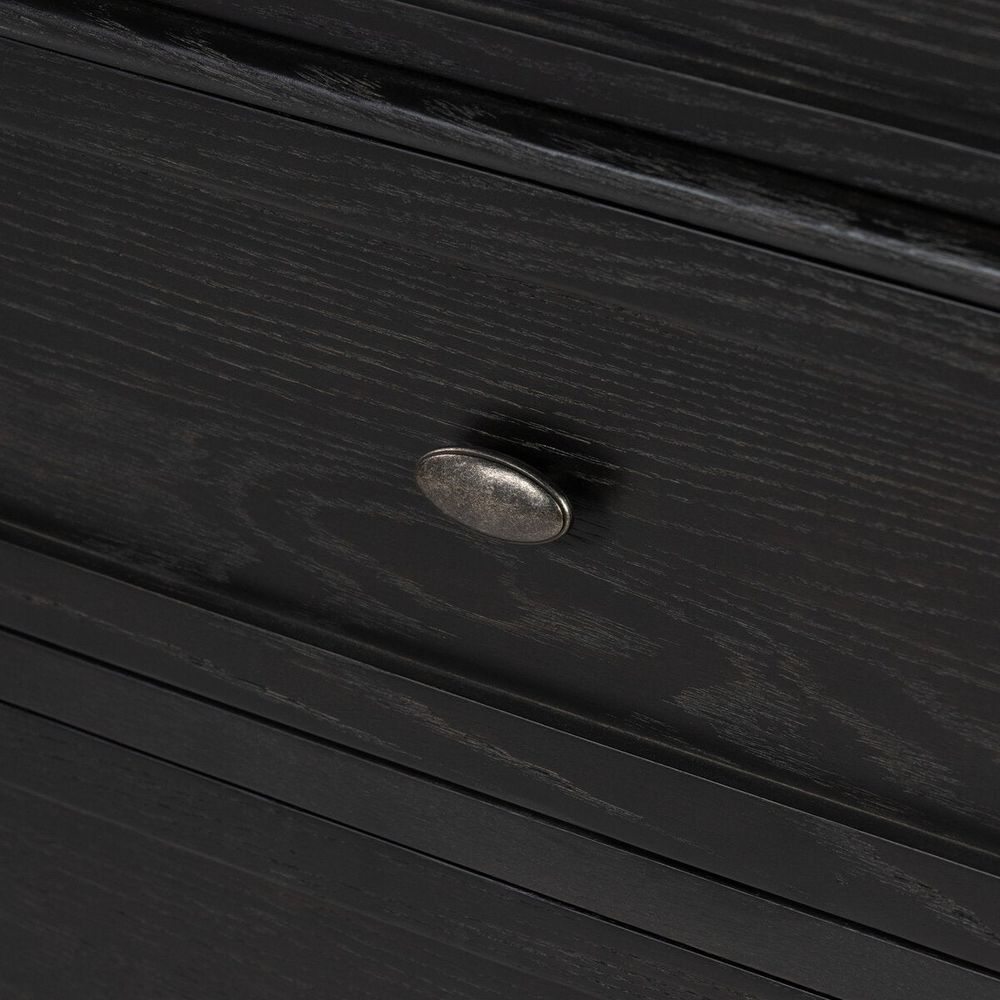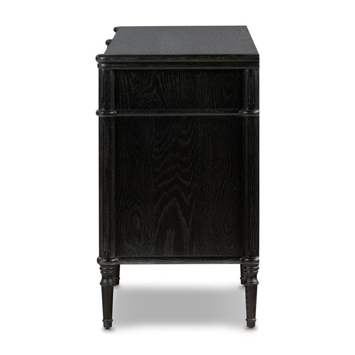 Influenced by vintage European lines, this spacious six-drawer dresser is elegant and full of presence. Framed panels, rounded corners and finished with aged brass drawer pulls and tapered spindle legs for character. Made from solid oak and veneer in distressed black for a classic look. This item has been modified to comply with the STURDY Act. See a full list of modified products and data changes in the "STURDY Act" file in the Downloads section below.