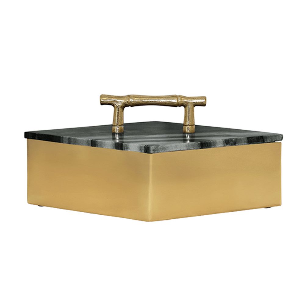 Description: SMALL DIAMOND SHAPED BRASS BOX WITH BLACK MARBLE TOP AND BRASS BAMBOO HANDLE *Marble is a natural stone and will vary slightly in color, pattern, and veining.