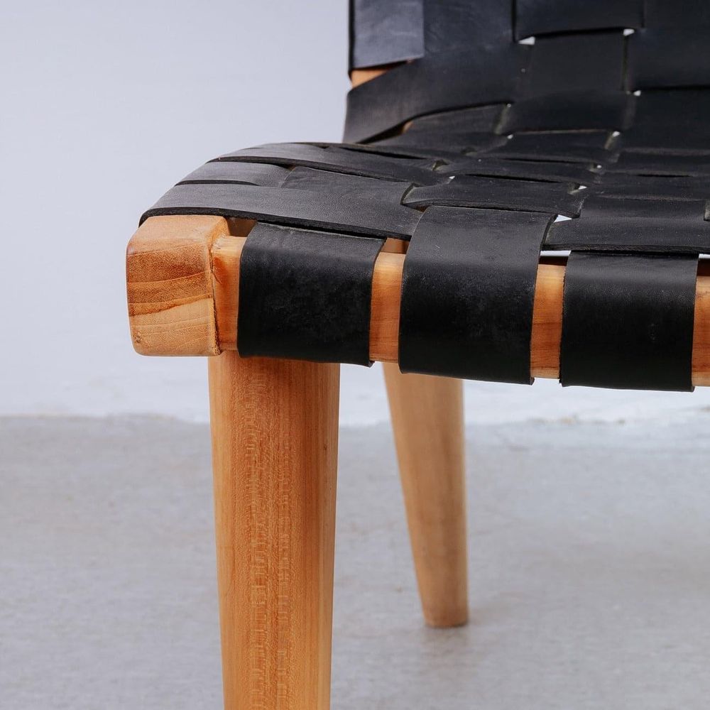 This handsome lounge chair is the perfect addition to modern and contemporary style spaces alike. The design is inspired by Jens Risom's mid-century classic, but with some contemporary tweaks to the materials. A sturdy teak frame provides ample support for the woven leather strap seat and back that seamlessly flow into each other. The simple design allows the texture of the weaving to shine through. Available in black or pink.
