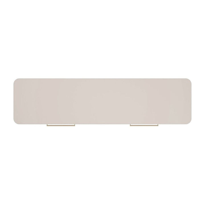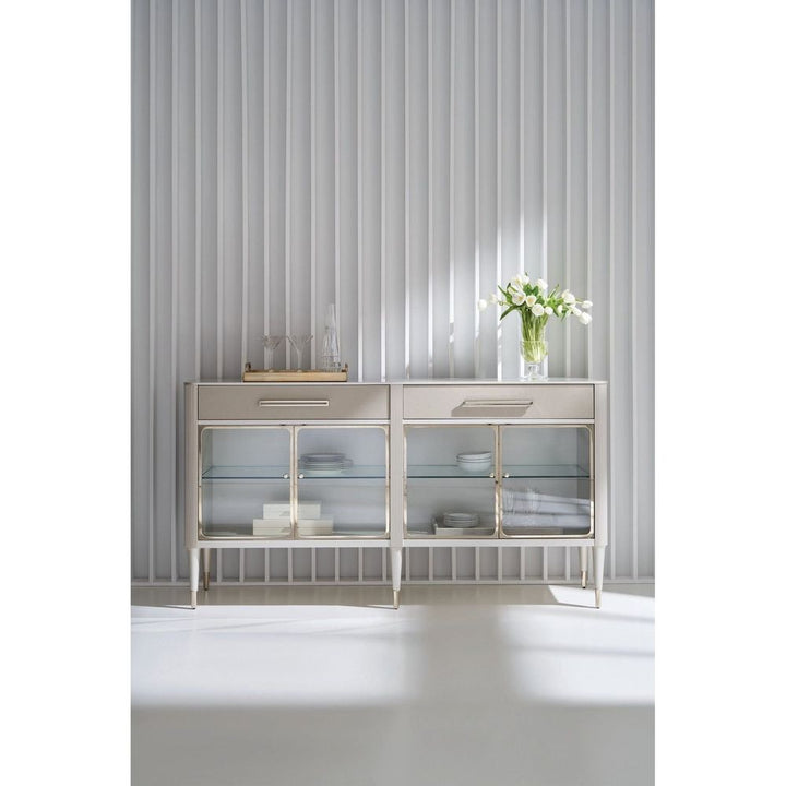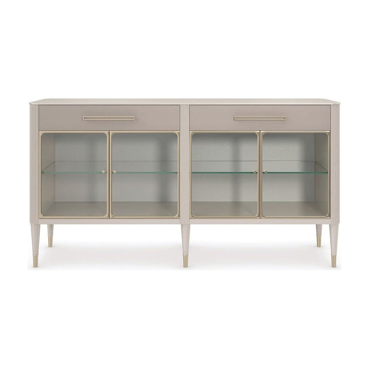 Features: Case and legs finished in Matte Pearl.Two drawers with vinyl wrapped fronts and undermount soft close guides.Four metal doors with Whisper of Gold framing and glass fronts.Interior with an adjustable glass shelf and light strip. Touch dimmer switch on bottom of rail on top right.Metal ferrules and collars in Whisper of Gold.Interior in Matte Pearl.