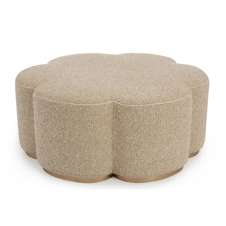 Description: This elegant cocktail ottoman features a round shape that is reminiscent of a modern dahlia. This design is upholstered in a light beige boucle tweed that has a hint of metallic. It is enhanced with an ivory leather welt and a wood plinth base in Valyrian gold. The sophisticated shape is accentuated with a row of nickel starburst nailheads. This Rosalie Cocktail Ottoman is available as shown in Valyrian Gold (V229) finish and Poplin Oat (5020) fabric.