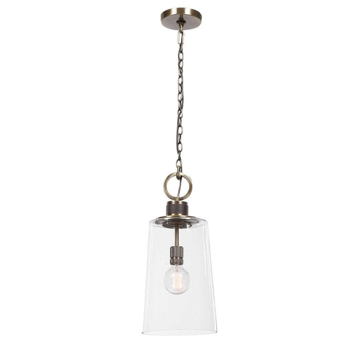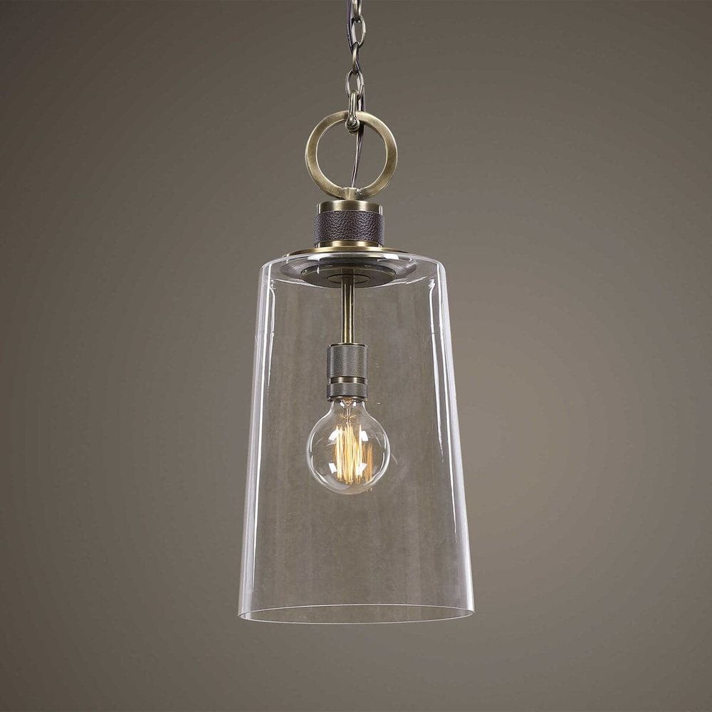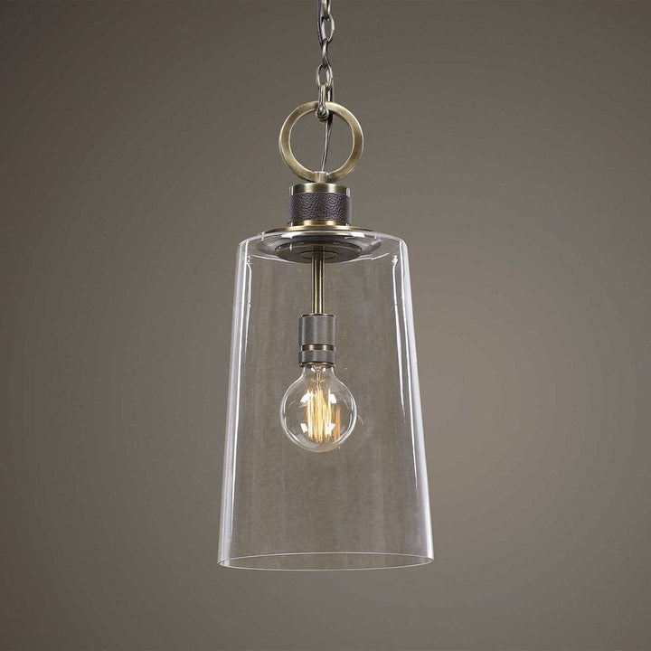 Refined industrial looks give this 1 Lt. mini pendant its design roots, with an antique brass finish, it is dressed up with a textured brown leather band at the top. 1-100 watt max Edison socket. Bulbs not included. Supplied with 12' wire and 5' chain for adjustable installation.