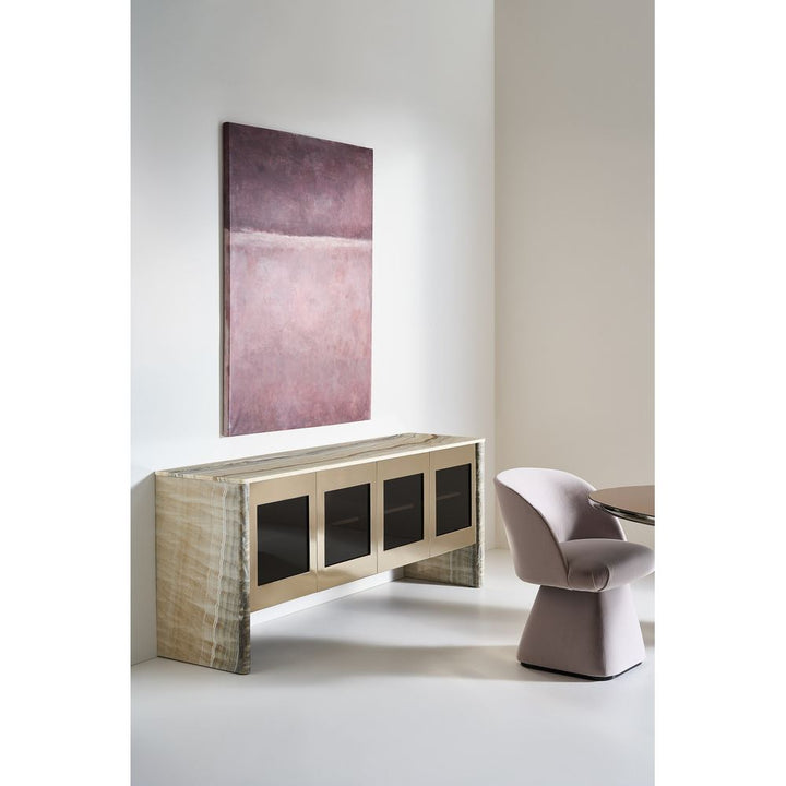 Dinner conversations will linger because your guests are so comfortable around your table. The Vuelta Swivel chairs are fully upholstered in light Taupe velvet with deep cushions and a softly curved back. The chair sits on a conical base that rests on an Almost Black plinth.